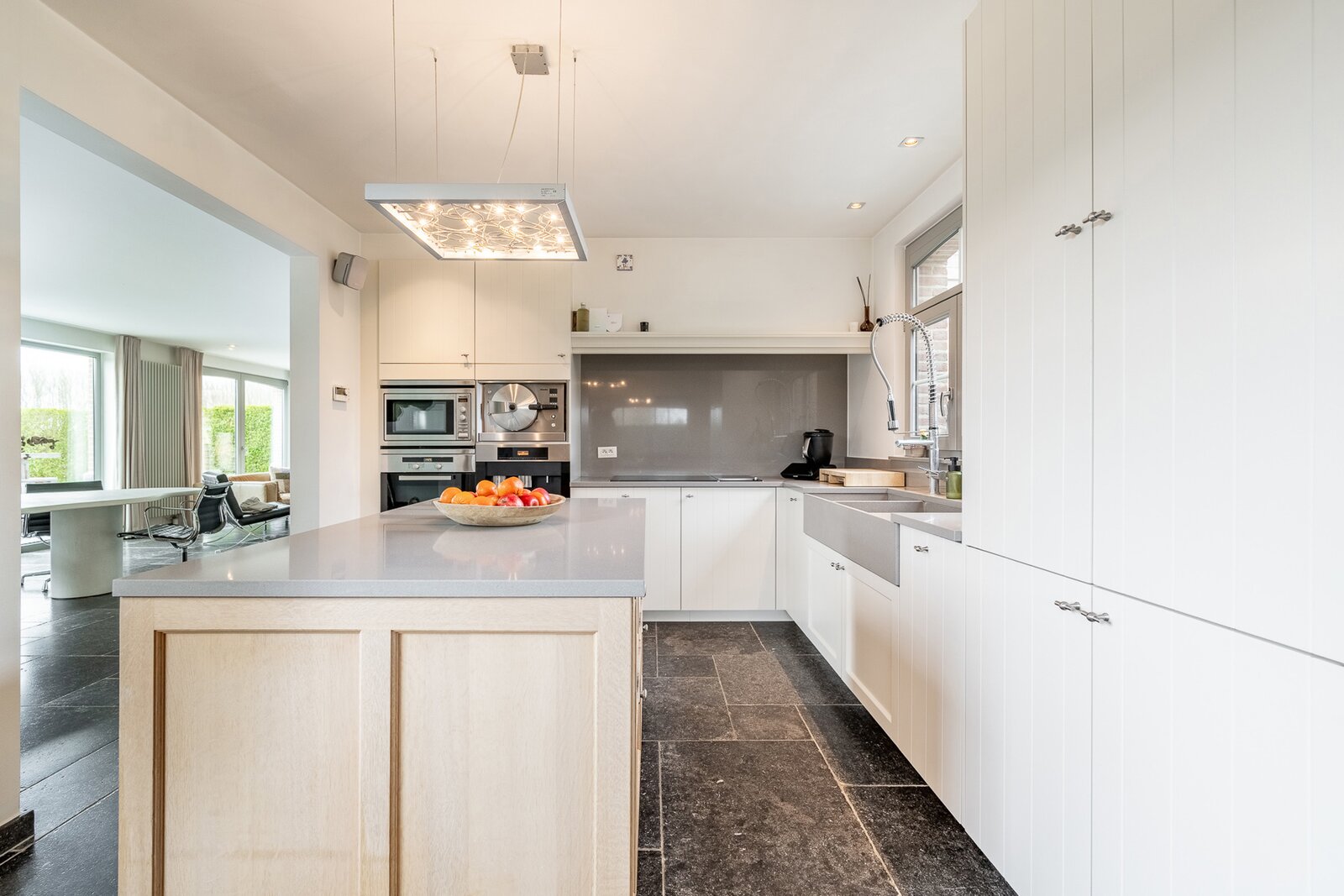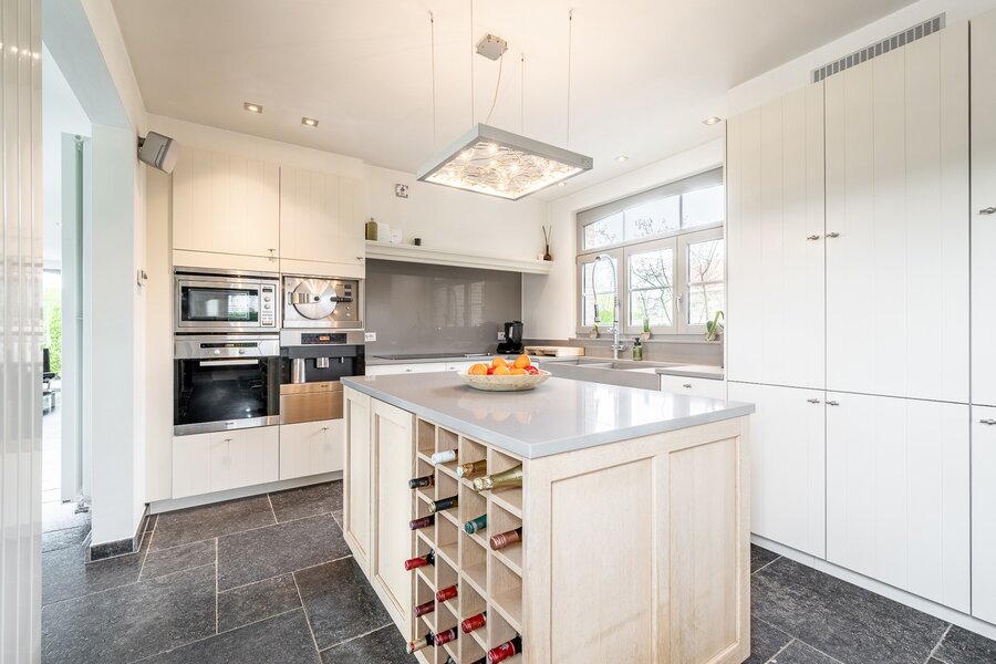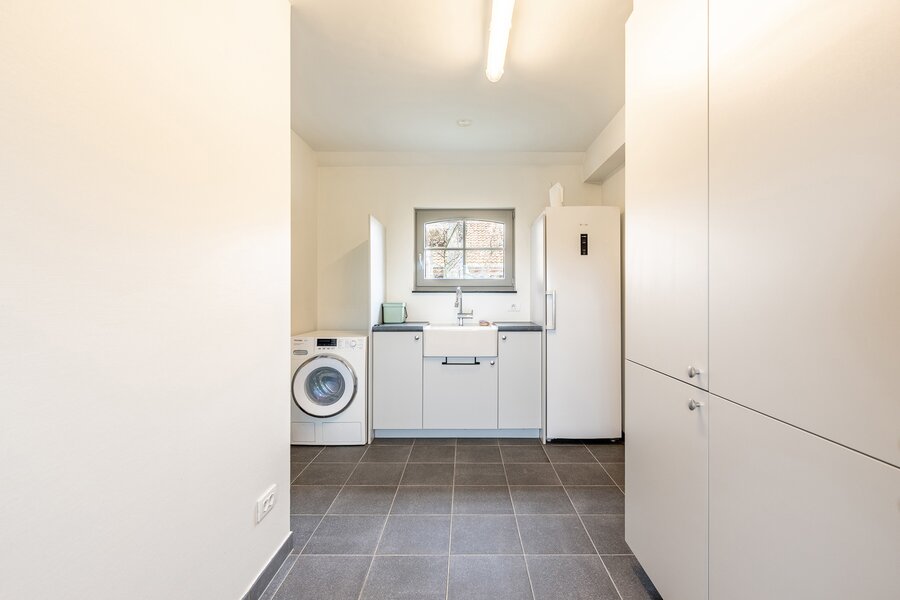 Bij het betreden van de woning komt u in een ruime inkomhal, die toegang biedt tot de lichtrijke leef- en eetruimte. Aansluitend bevindt zich de open keuken, voorzien van een gezellige extra eethoek. Bijkomend een ruime kelder.
