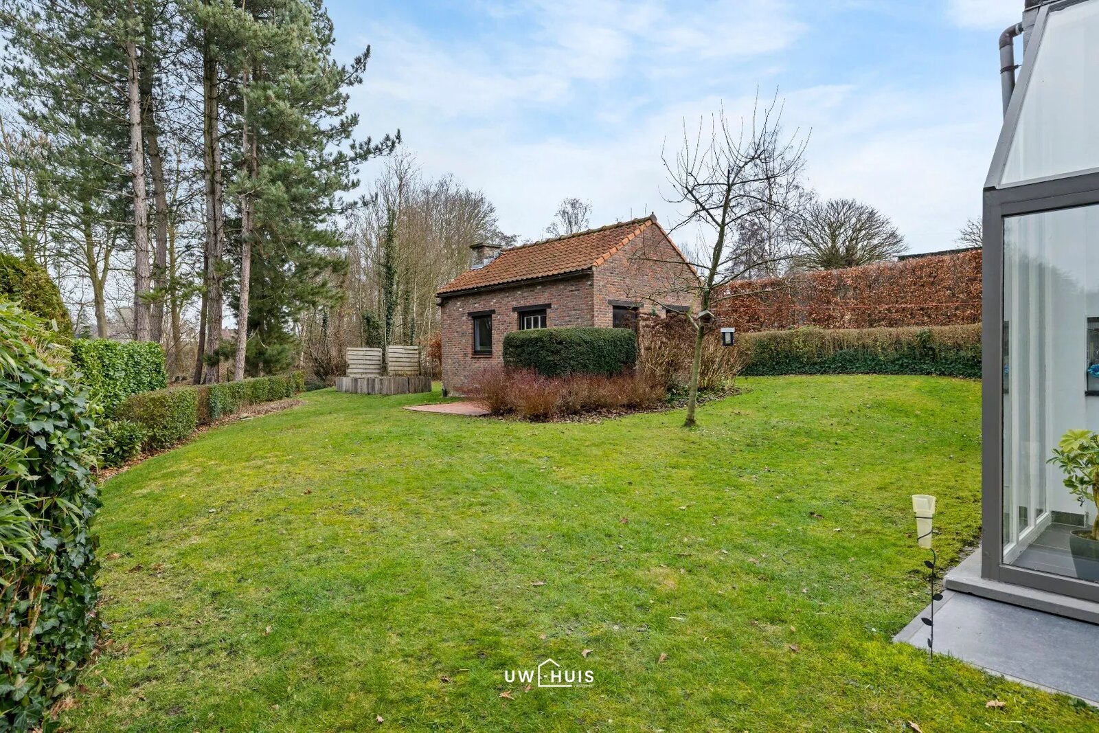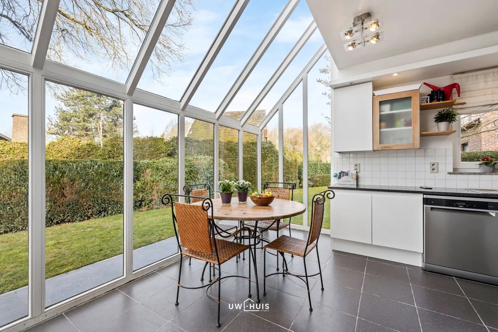 De gezellige leefruimte baadt in het licht dankzij de overvloedige zoninval en sluit mooi aan op de leefkeuken die het hart vormt van de woning en beschikt over een bijzonder aangename ontbijthoek met prachtig zicht op het verzorgde tuin.