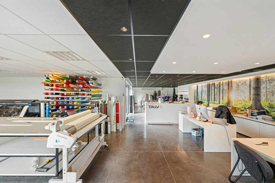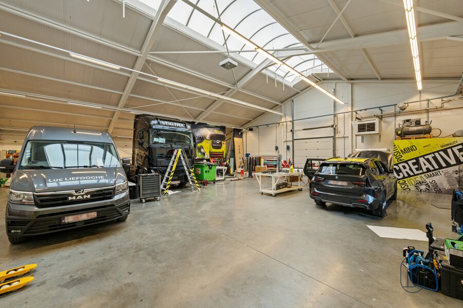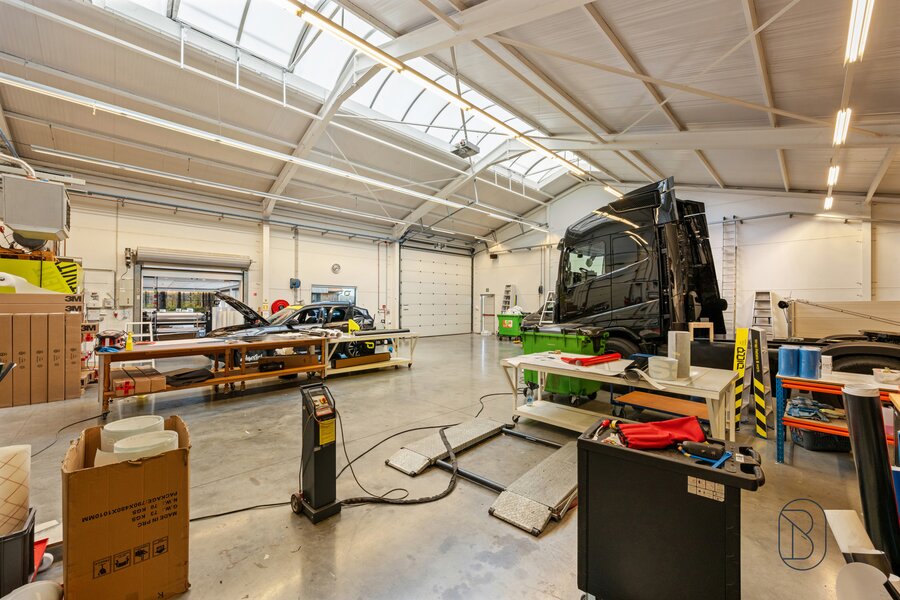 Het bedrijfsgedeelte omvat lichtrijke burelen met zicht op het omliggende groen en een ruime werkplaats/magazijn met hoge poort. Bovendien is er ruime parkeergelegenheid aanwezig op het domein.