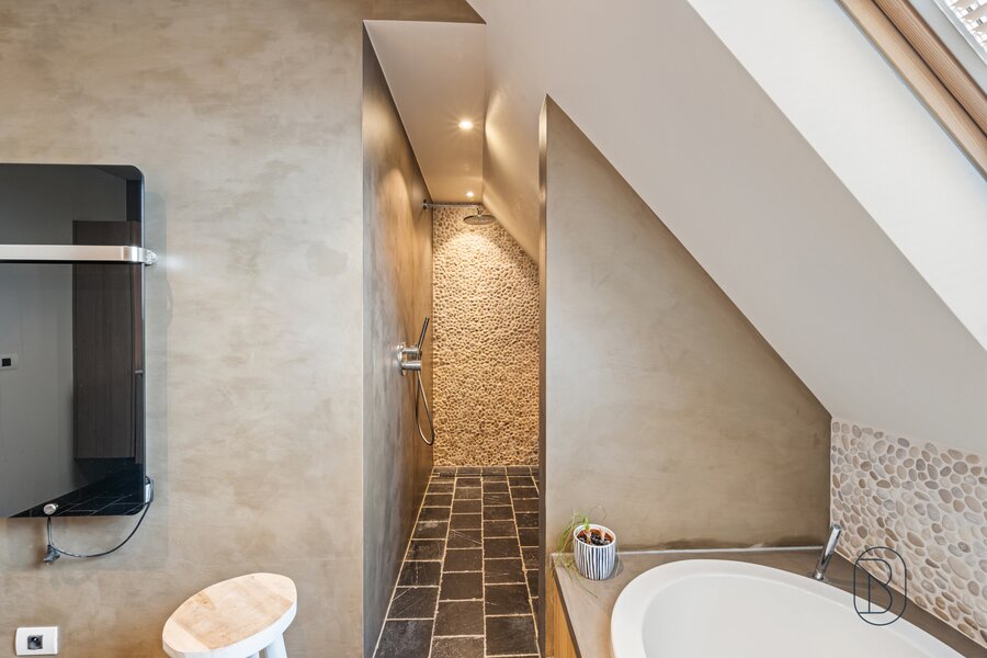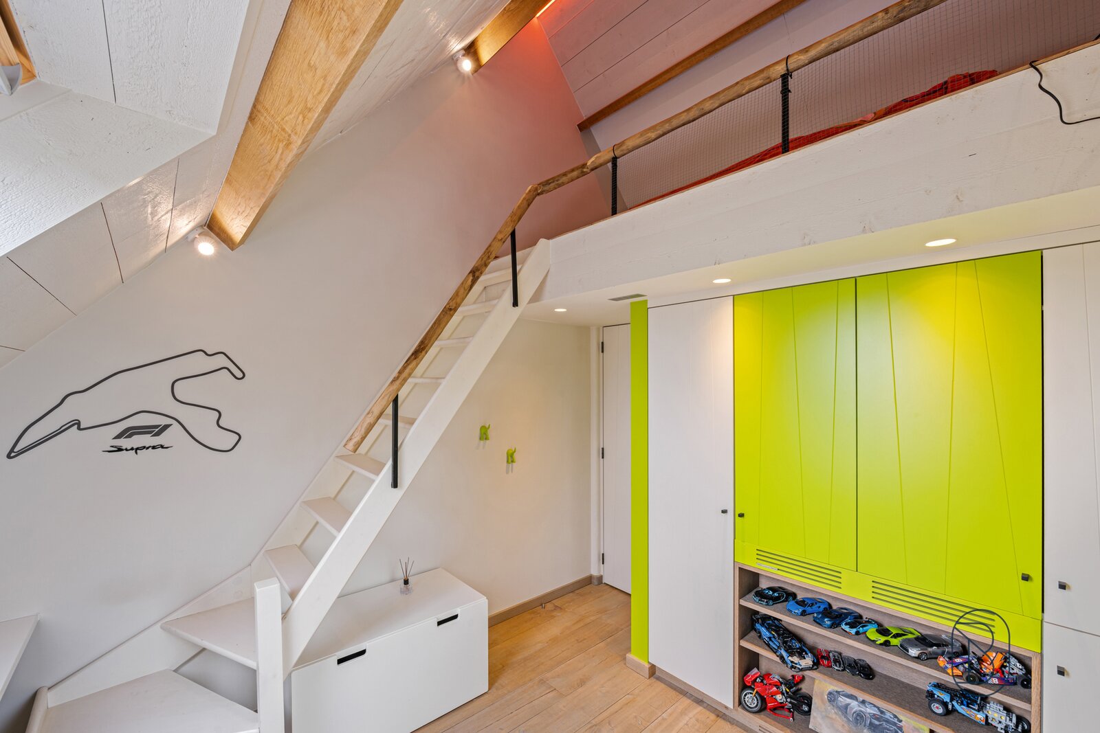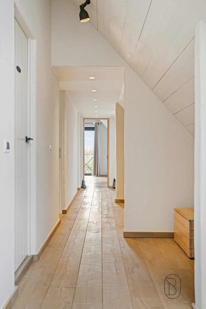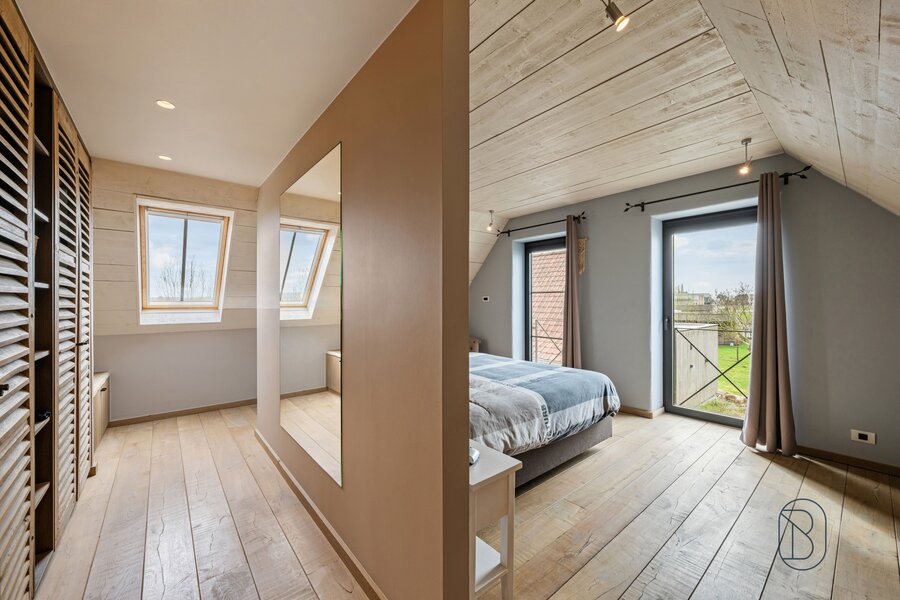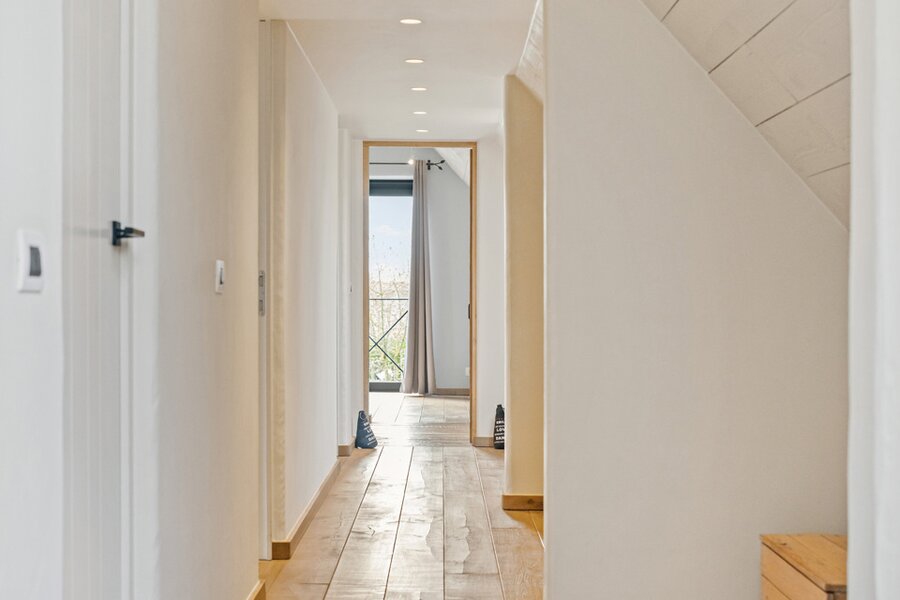 De woning verwelkomt u via een stijlvolle inkomhal met vestiaire en gastentoilet. De lichtrijke leefruimte met open, volledig uitgeruste keuken vormt het hart van de woning en sluit naadloos aan op de eetplaats en gezellige zithoek, met een prachtig zicht op de aangelegde tuin. Verder vindt u op het gelijkvloers een aparte bureauruimte en een praktische was-/bergplaats.