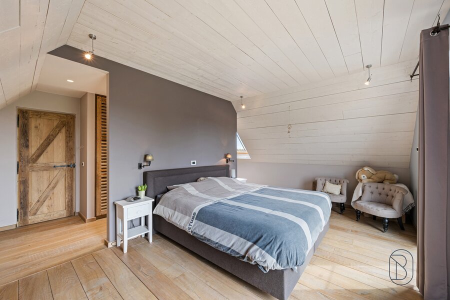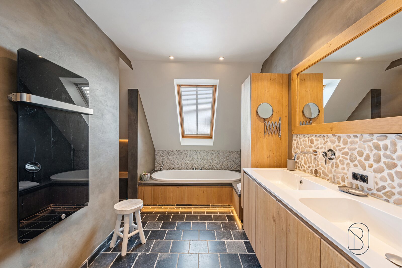 Op de verdieping bevinden zich vier volwaardige slaapkamers, waaronder een master bedroom met dressing en drie kinderkamers met mezzanine (twee met lavabo), evenals twee comfortabele badkamers met onder meer een ligbad en inloopdouche.