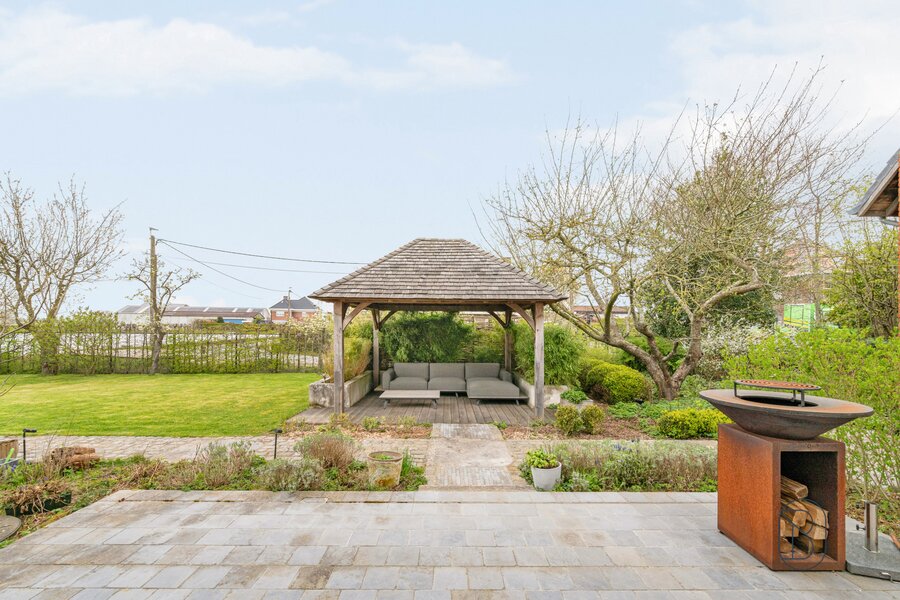 Buiten geniet u van een zuidgerichte, fraai aangelegde tuin met zonneterrassen, zwembad en een weids uitzicht. Het geheel wordt vervolledigd door een polyvalent bijgebouw ingericht als garage, hobbyruimte en berging met afgewerkte zolder.