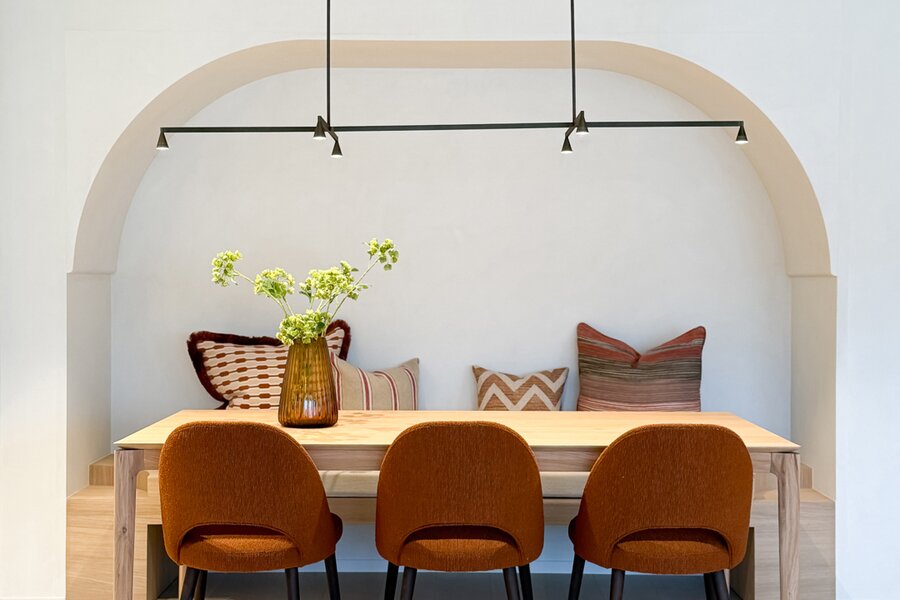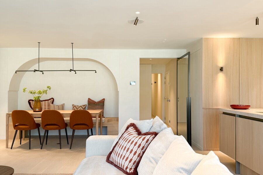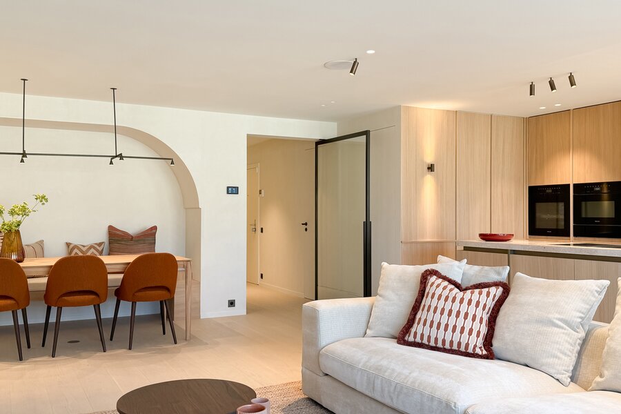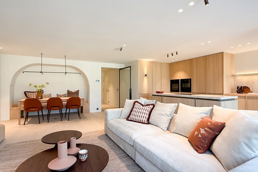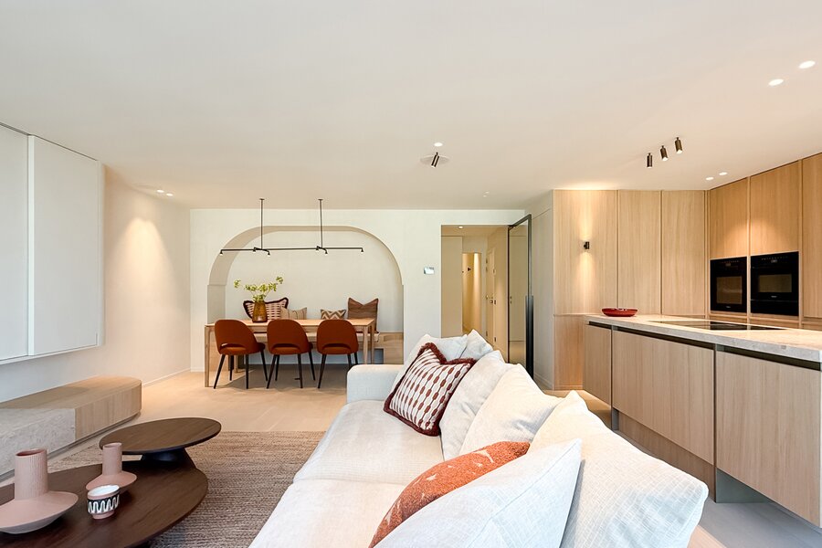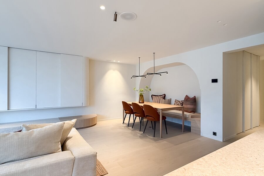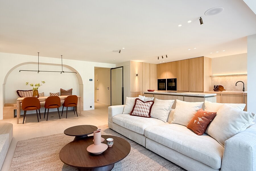 De lichtrijke woonkamer met terras vormt het hart van het appartement en biedt een prachtig uitzicht. De open keuken met eiland sluit hier naadloos op aan, aangevuld met een praktische berging en een gezellige eethoek in een verfijnde nis.