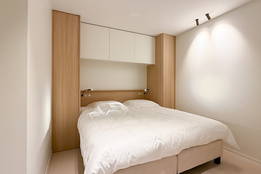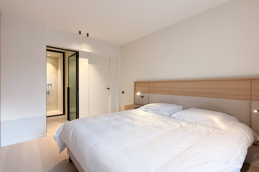 Het appartement beschikt over drie volwaardige slaapkamers. Twee kamers achteraan geven uit op een zonnig terras en hebben elk een en-suite badkamer. De derde slaapkamer beschikt over een eigen douchekamer.