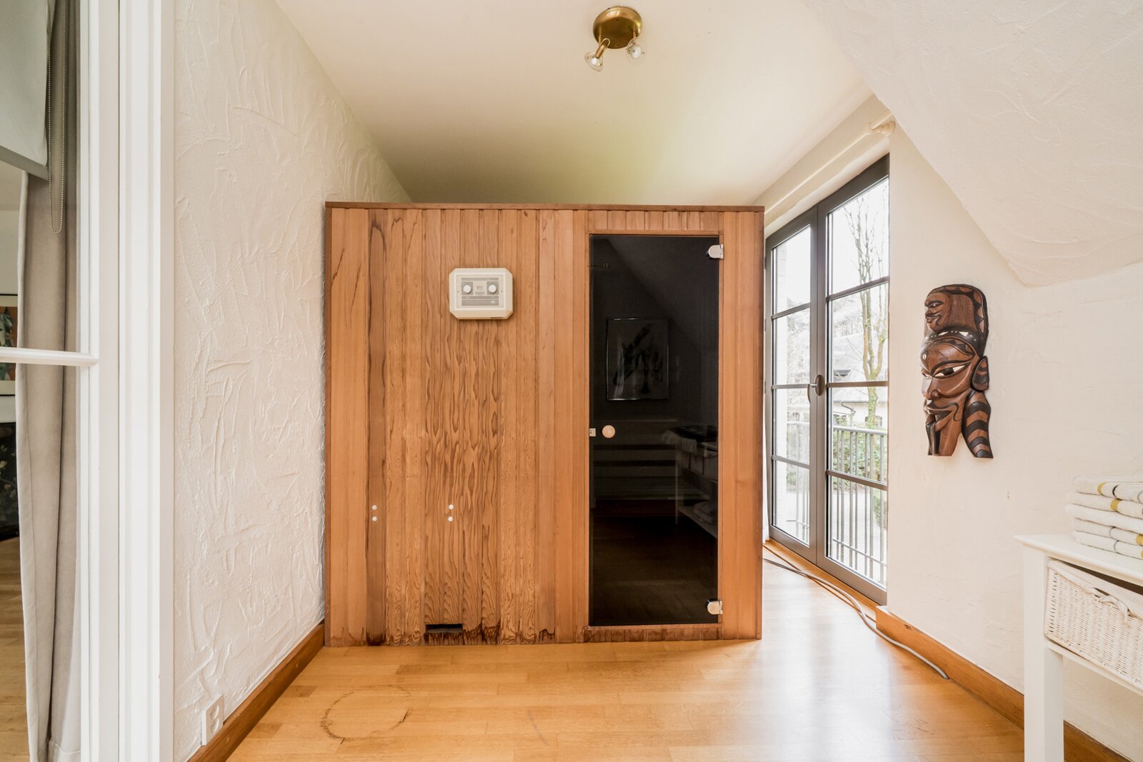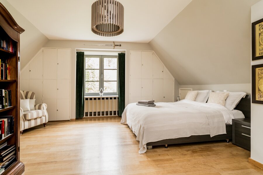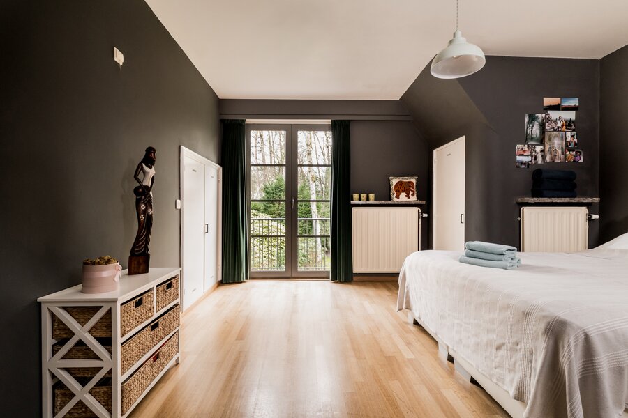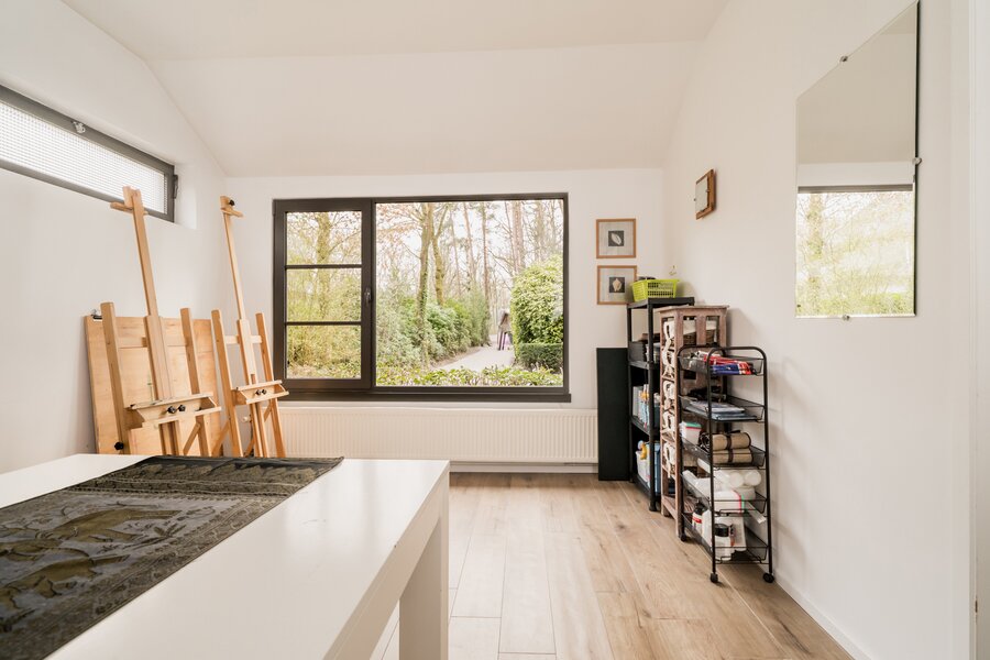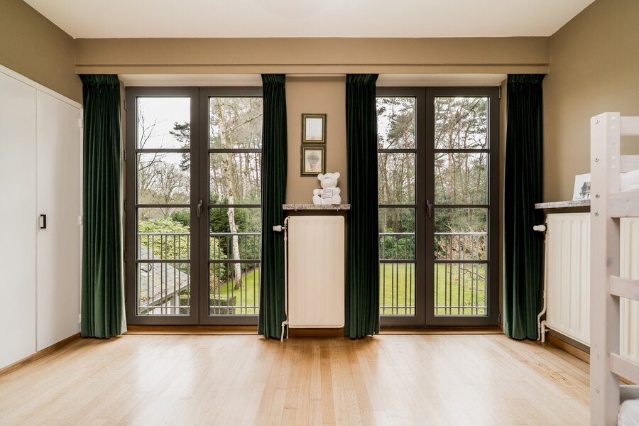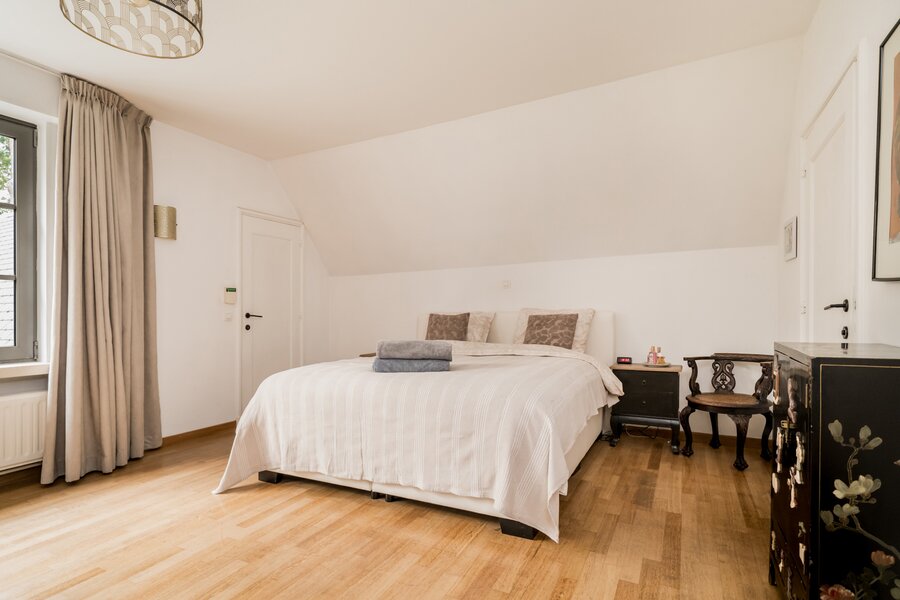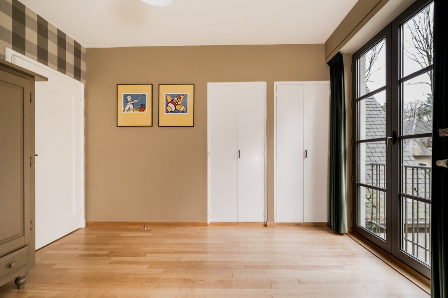 De villa werd doorheen de jaren netjes gerenoveerd en is als volgt ingedeeld: Ruime inkomhal op tegelvloer met gastentoilet met handenwasser en vestiairekast. Naast de inkomhal bevindt zich een aparte kantoorruimte op parket met gashaard. Verder door betreden we de open en ruime leefruimte op parket. De leefruimte bestaat uit een gezellige zithoek met gashaard. Aansluitend bevindt zich de open leefkeuken. Hiernaast bevindt zich nog een gezellige open en lichte eetkamer, met haard, en omgeven door ramen en zicht op de tuin. Aansluitend is er nog een gezellig en zonnig terras. Tenslotte bevindt er zich op het gelijkvloers nog een praktische wasplaats met veel opbergkasten en een laatste polyvalente ruimte met water aansluiting. Ideaal als hobbyruimte of speelkamer. Via de royale trap in de inkomhal toegang tot de eerste verdieping die als volgt is ingedeeld: Ruime en lichte overloop. Eerste zeer ruime kamer op parket met zicht op het achtergelegen natuurdomein. Tweede kamer op parket met zicht op de tuin. Derde kamer op parket met zicht op de tuin. Badkamer met douche, dubbele wastafel en wc. Ingemaakte vestiarekasten op de overloop. Ruime hoofdslaapkamer op parket met ensuite badkamer met ligbad, douche, dubbele wastafel en wc. (vernieuwd) Hiernaast bevindt zich ook nog een praktische inloopdressing en tenslotte nog een 5e ruimte waar momenteel een sauna is ondergebracht.