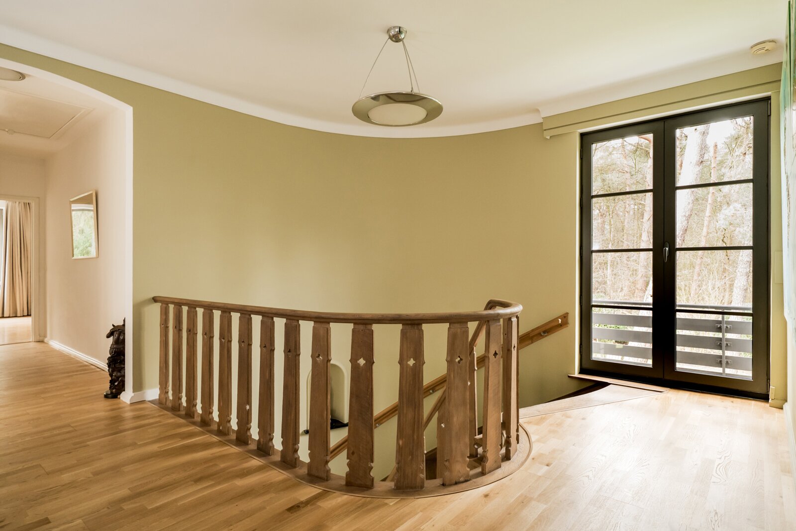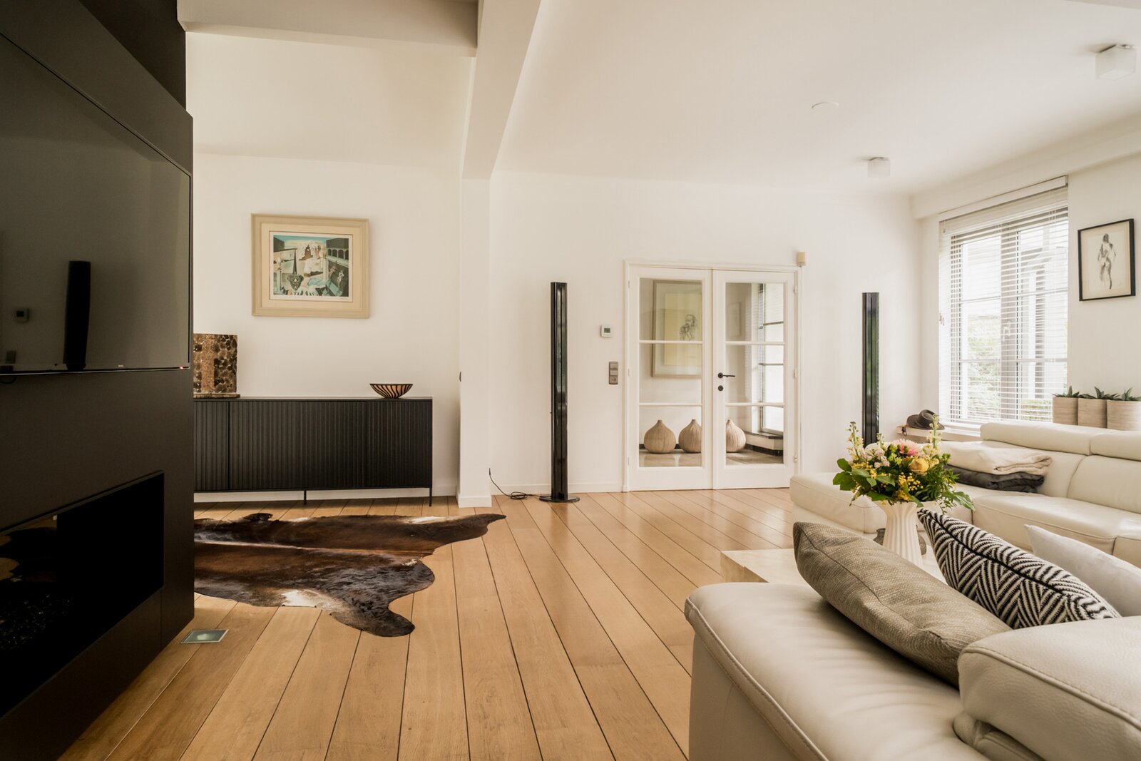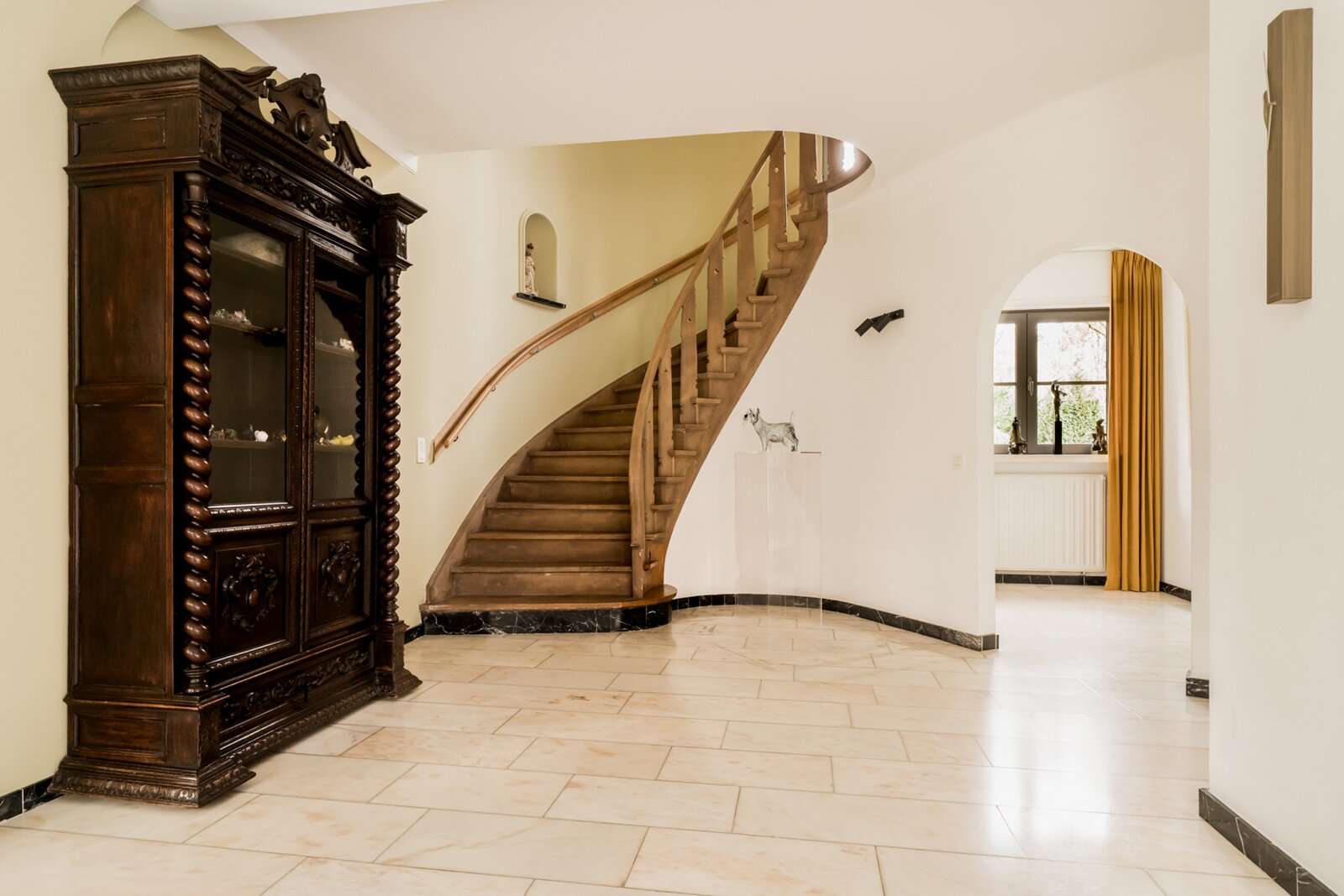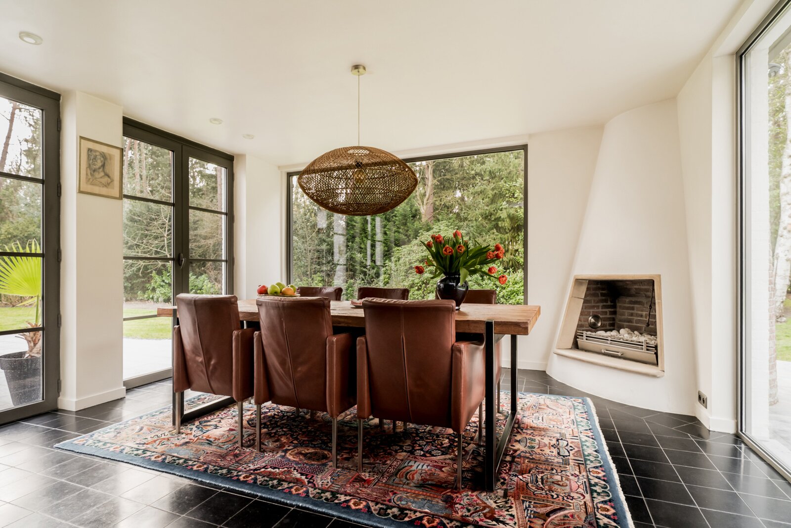 De villa werd doorheen de jaren netjes gerenoveerd en is als volgt ingedeeld: Ruime inkomhal op tegelvloer met gastentoilet met handenwasser en vestiairekast. Naast de inkomhal bevindt zich een aparte kantoorruimte op parket met gashaard. Verder door betreden we de open en ruime leefruimte op parket. De leefruimte bestaat uit een gezellige zithoek met gashaard. Aansluitend bevindt zich de open leefkeuken. Hiernaast bevindt zich nog een gezellige open en lichte eetkamer, met haard, en omgeven door ramen en zicht op de tuin. Aansluitend is er nog een gezellig en zonnig terras. Tenslotte bevindt er zich op het gelijkvloers nog een praktische wasplaats met veel opbergkasten en een laatste polyvalente ruimte met water aansluiting. Ideaal als hobbyruimte of speelkamer. Via de royale trap in de inkomhal toegang tot de eerste verdieping die als volgt is ingedeeld: Ruime en lichte overloop. Eerste zeer ruime kamer op parket met zicht op het achtergelegen natuurdomein. Tweede kamer op parket met zicht op de tuin. Derde kamer op parket met zicht op de tuin. Badkamer met douche, dubbele wastafel en wc. Ingemaakte vestiarekasten op de overloop. Ruime hoofdslaapkamer op parket met ensuite badkamer met ligbad, douche, dubbele wastafel en wc. (vernieuwd) Hiernaast bevindt zich ook nog een praktische inloopdressing en tenslotte nog een 5e ruimte waar momenteel een sauna is ondergebracht.