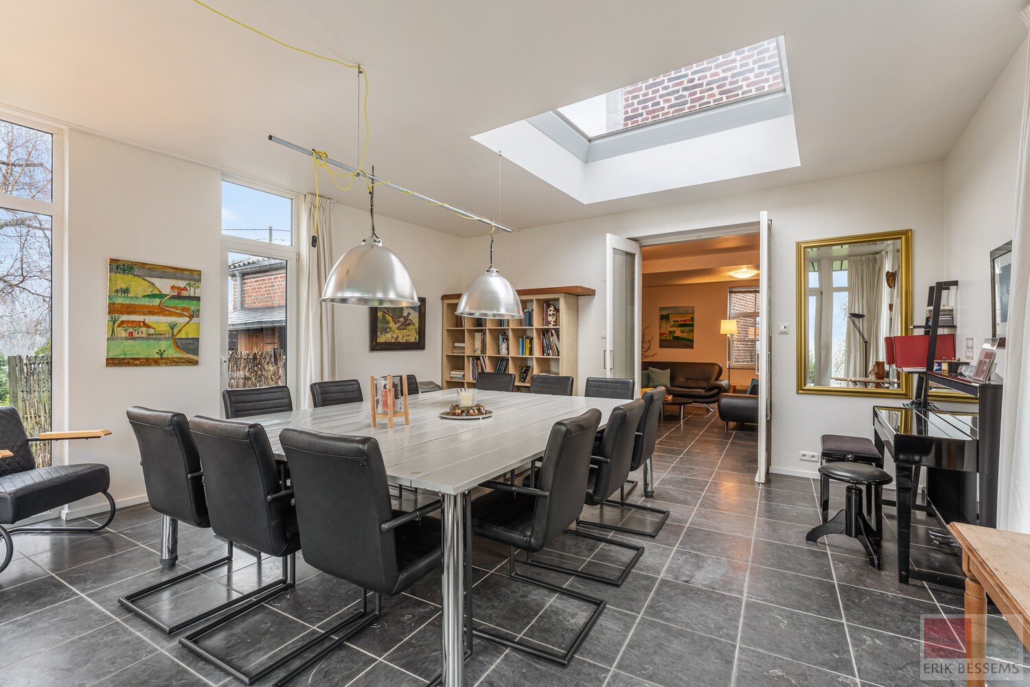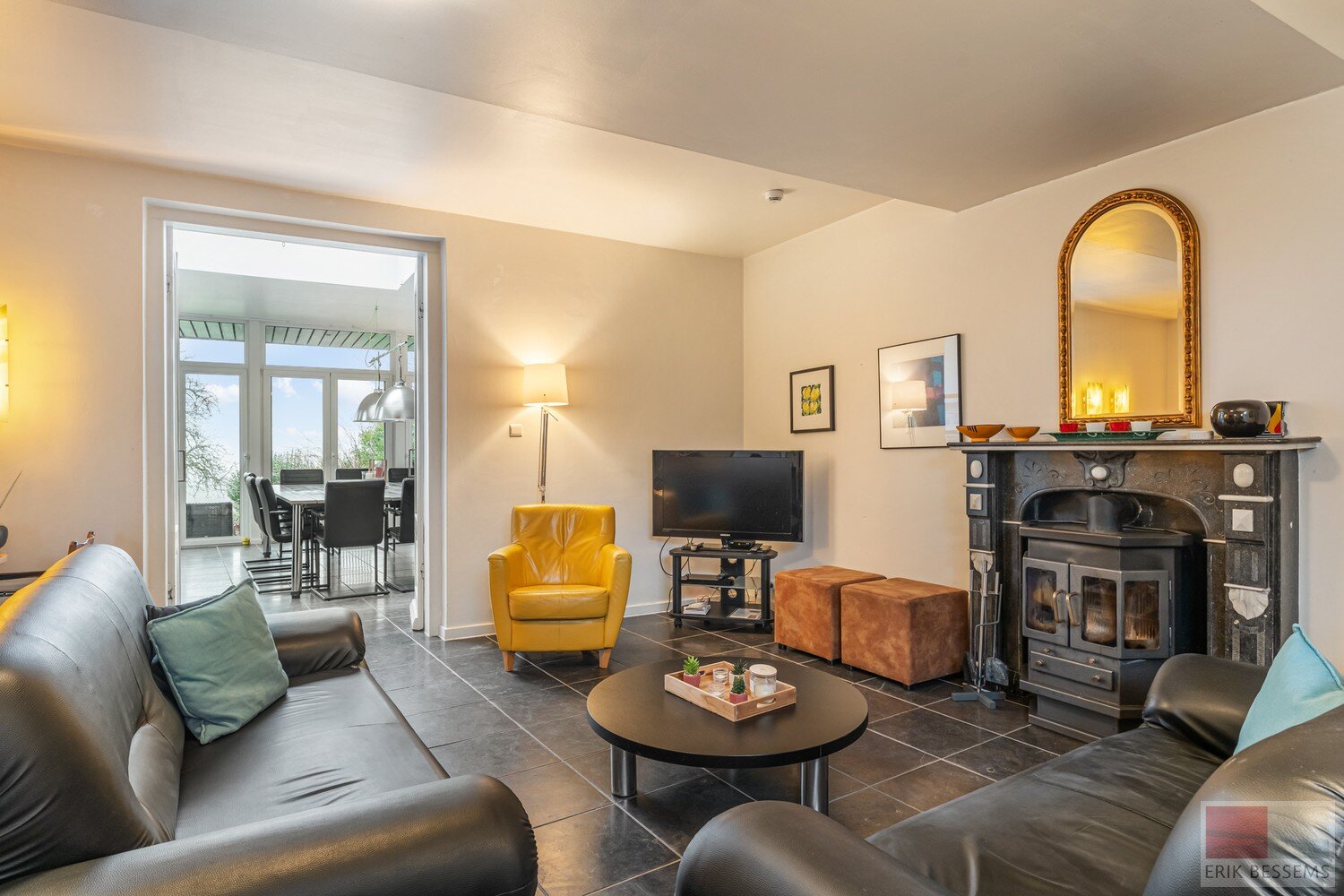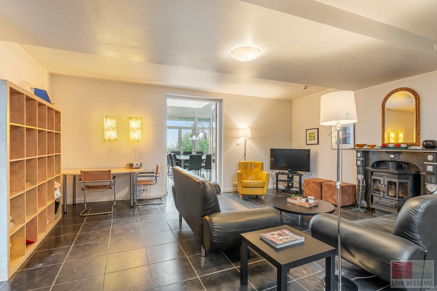 - Leefruimte met houthaard, tv-aansluitingen, lichtrijke eetplaats (veranda met lichtkoepel) met zicht op de achterliggende weides;
