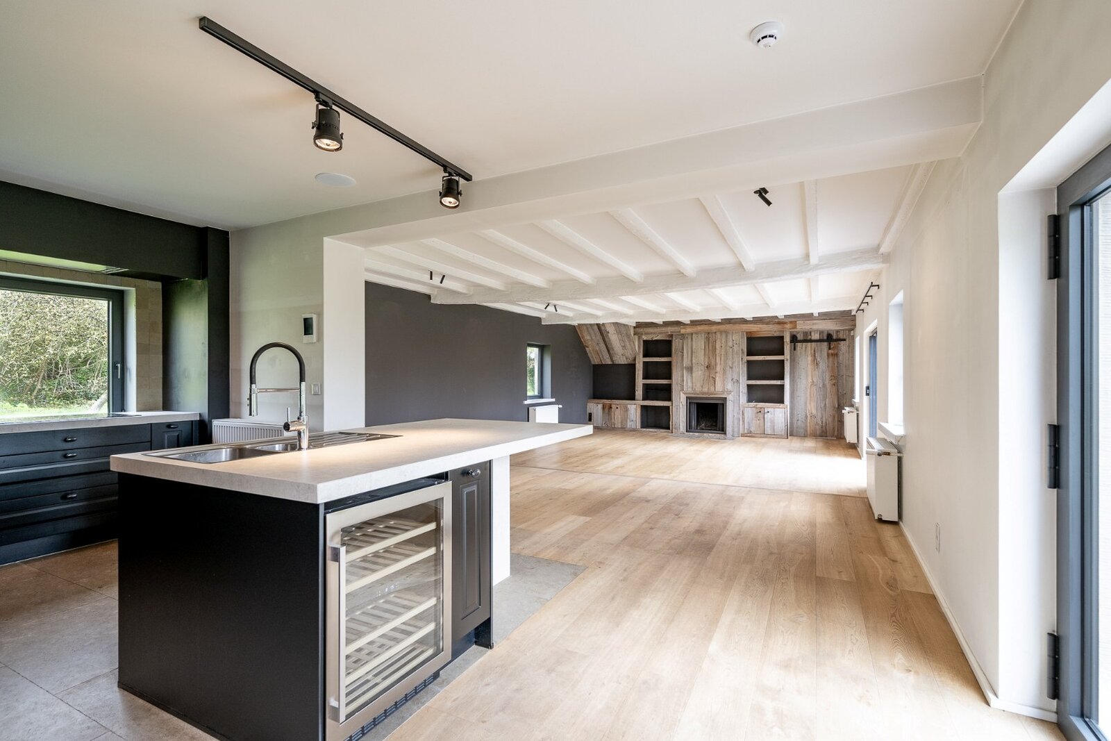 Indeling: Gelijkvloers: Stijlvolle inkomhal met vestiaire en gastentoilet. Aansluitend bevindt zich de gezellige, ruime living met open haard. Open keuken, volledig ingericht met inloopkast naar een praktische wasruimte. Aparte gezellige ruimte die kan ingevuld worden als 2e eetplaats of bureau. Slaapkamer met aanpalend douchekamer.