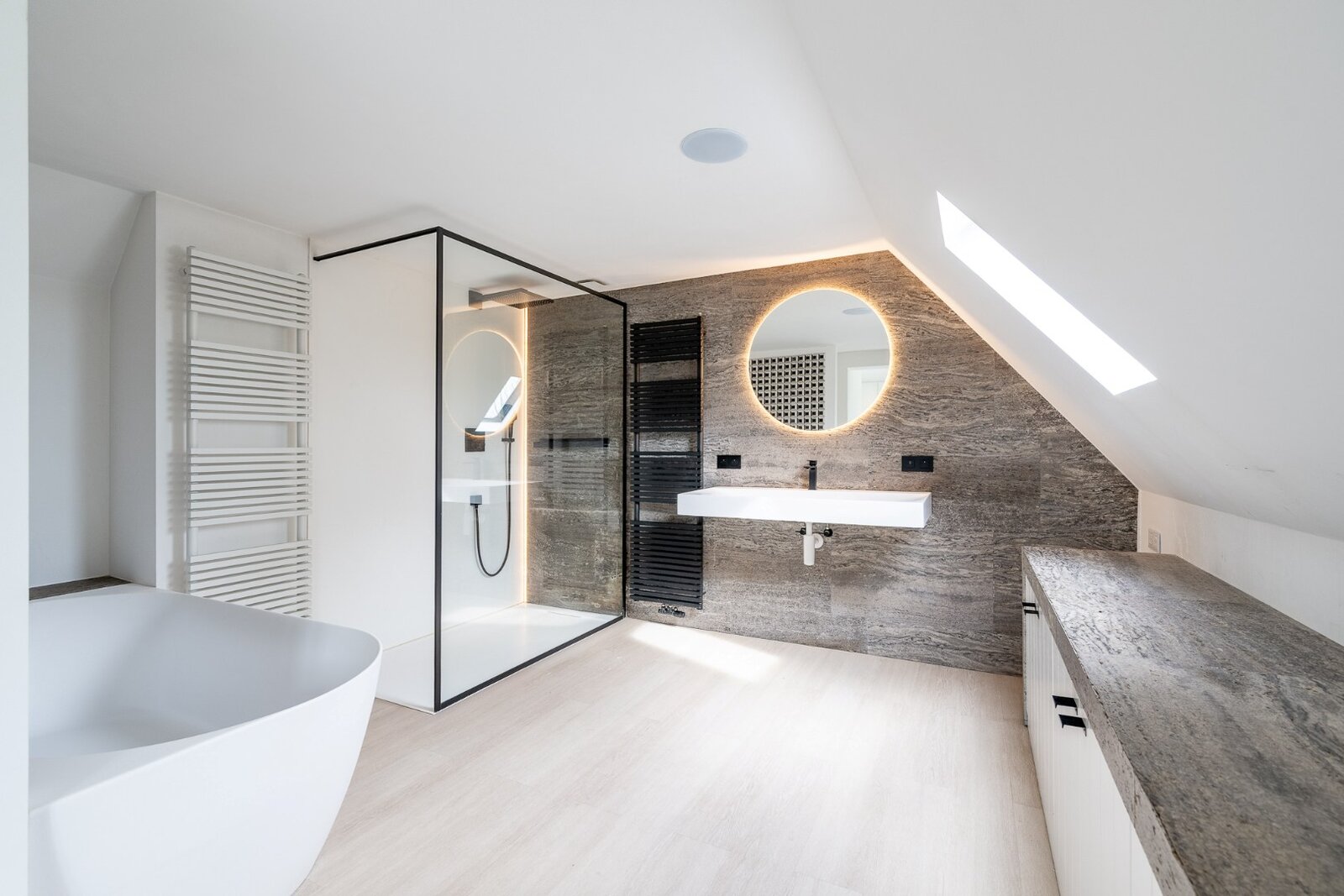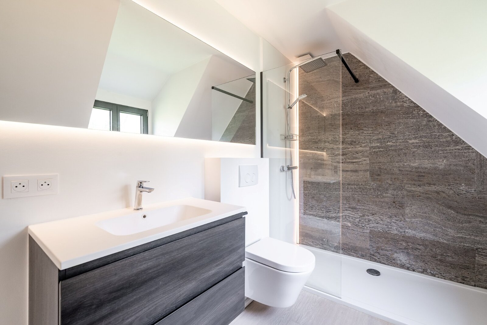 Eerste verdieping: masterbedroom met ensuite badkamer voorzien van een ligbad, douche en lavabo. Derde saapkamer met aanpalend douchekamer. De vierde slaapkamer geniet van een privatieve badkamer met bad, lavabo en wasruimte.