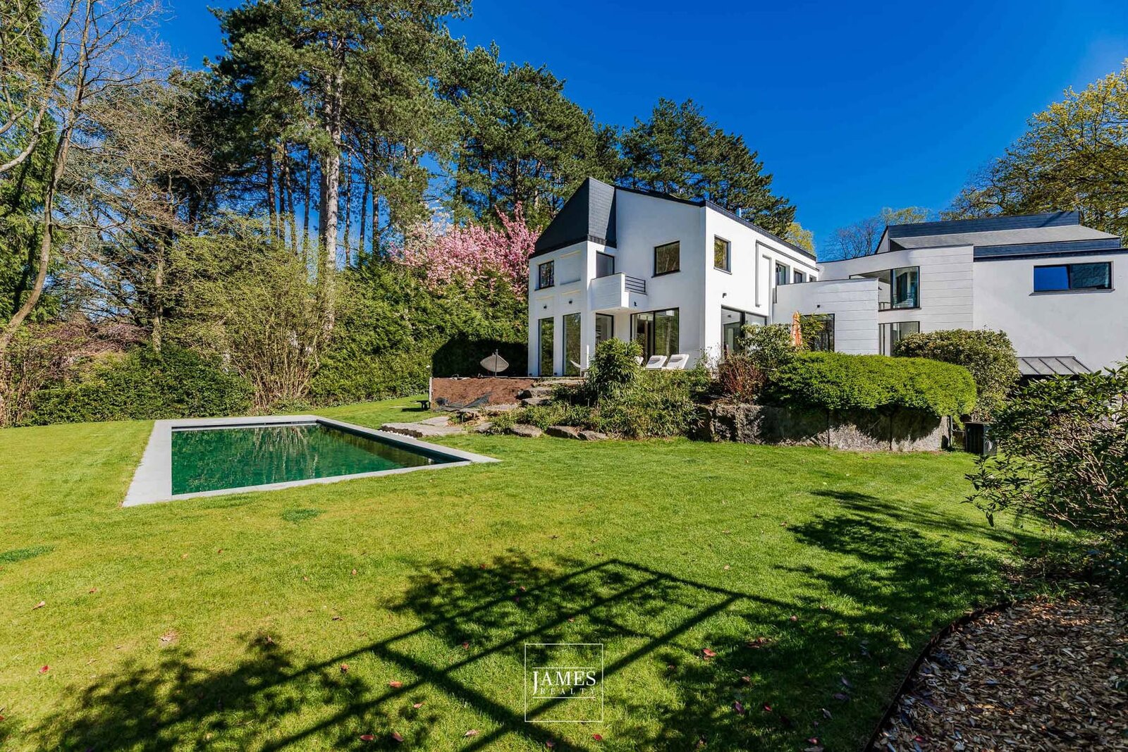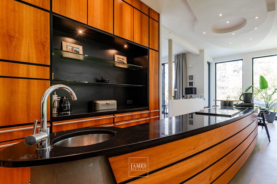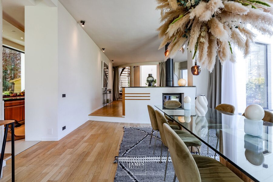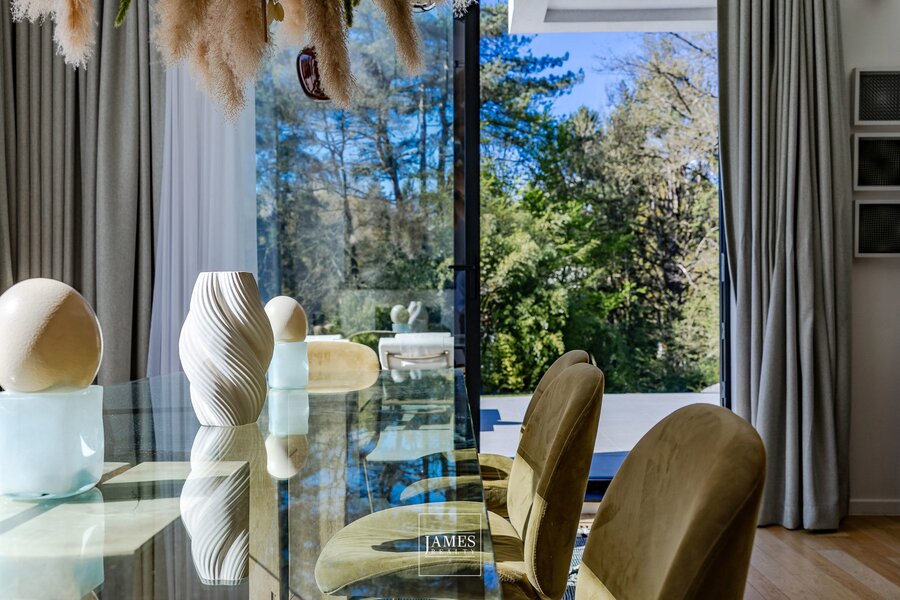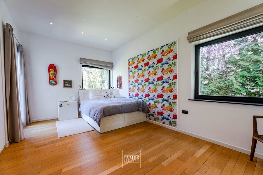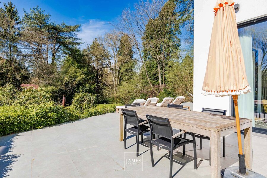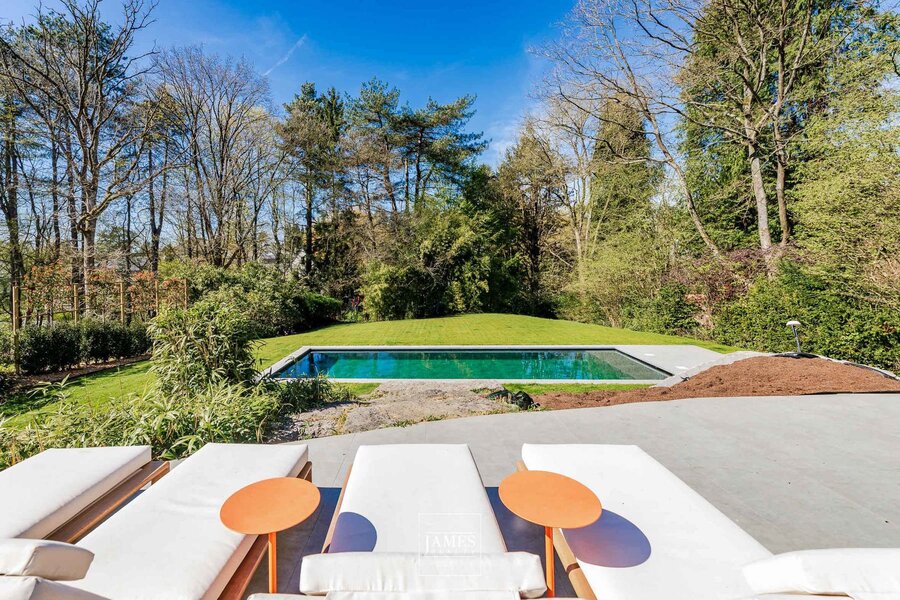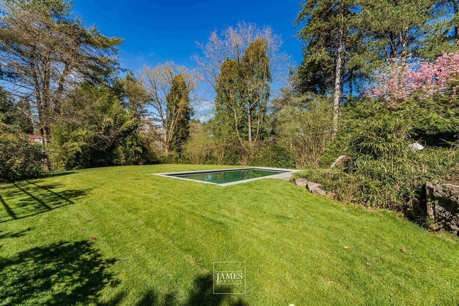 In de wijk Erables/Tilleuls, vlakbij het Zoniënwoud, in een rustige en groene woonstraat, prachtige, recent gerenoveerde villa in moderne stijl met op de begane grond een majestueuze entreehal, zeer ruime ontvangstruimtes, een grote, volledig uitgeruste woonkeuken en een mooi kantoor. Op de verdieping is er een grote, open centrale hal die toegang geeft tot een ouderslaapkamer met master bedroom en een kindervleugel met 4 slaapkamers en twee badkamers. Op het lagere niveau bevinden zich een grote fitnessruimte met doucheruimte en toilet, een multifunctionele ruimte, een thuisbioscoop en een kelder. Grote garage voor twee auto's. De buitenvoorzieningen omvatten mooie terrassen met een ideale ligging en een prachtig buitenzwembad. EPC B.