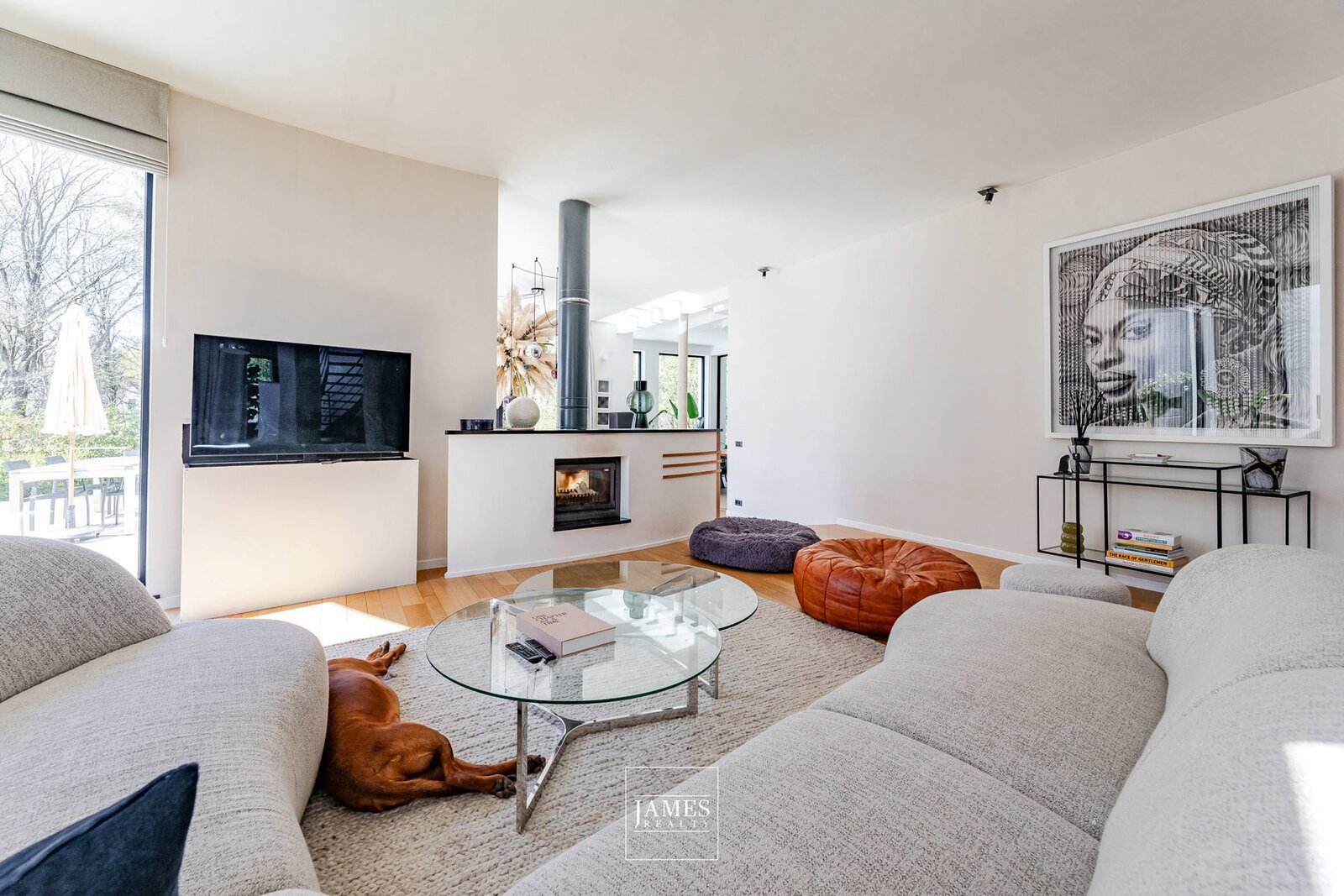 Grote, licht verhoogde woonkamer met open haard die uitkijkt op een prachtig terras en de tuin