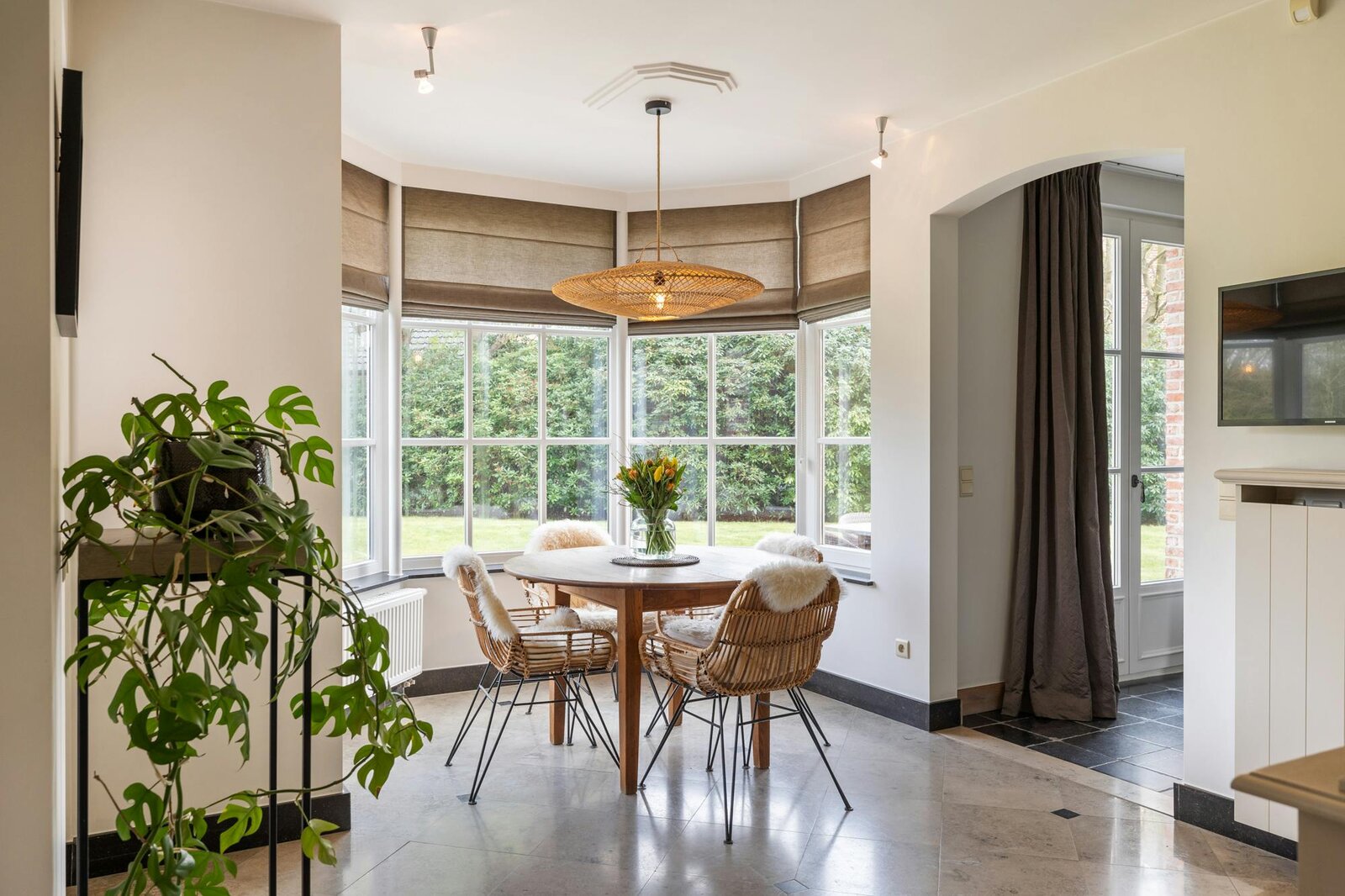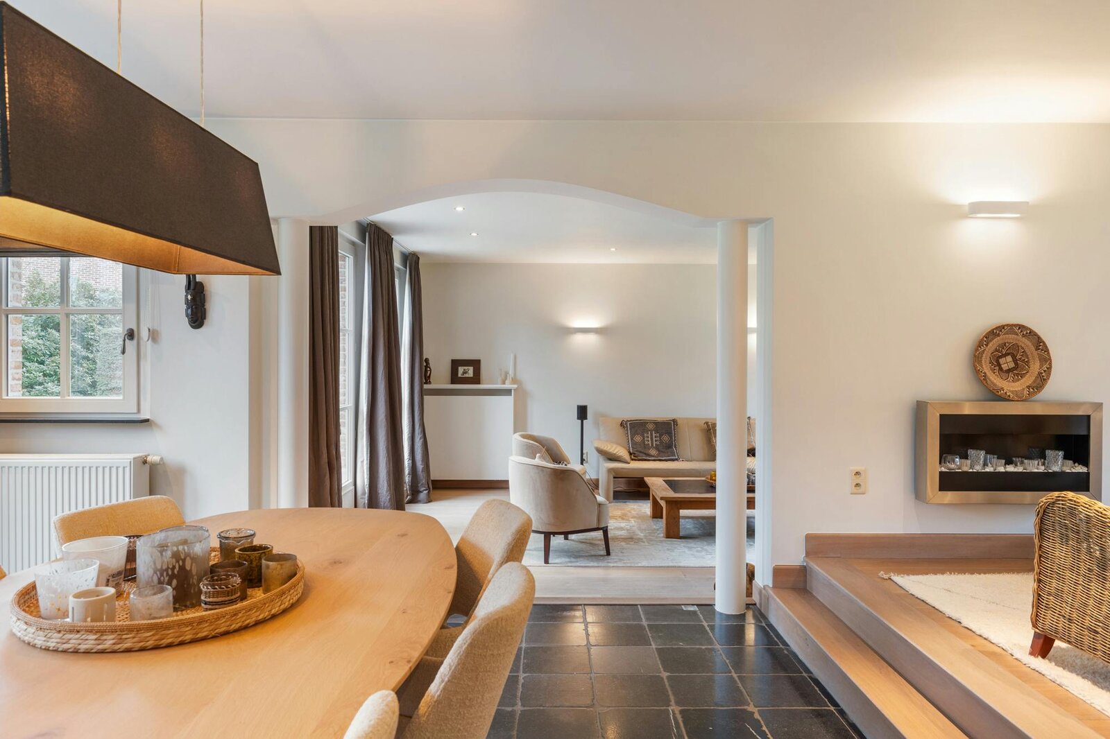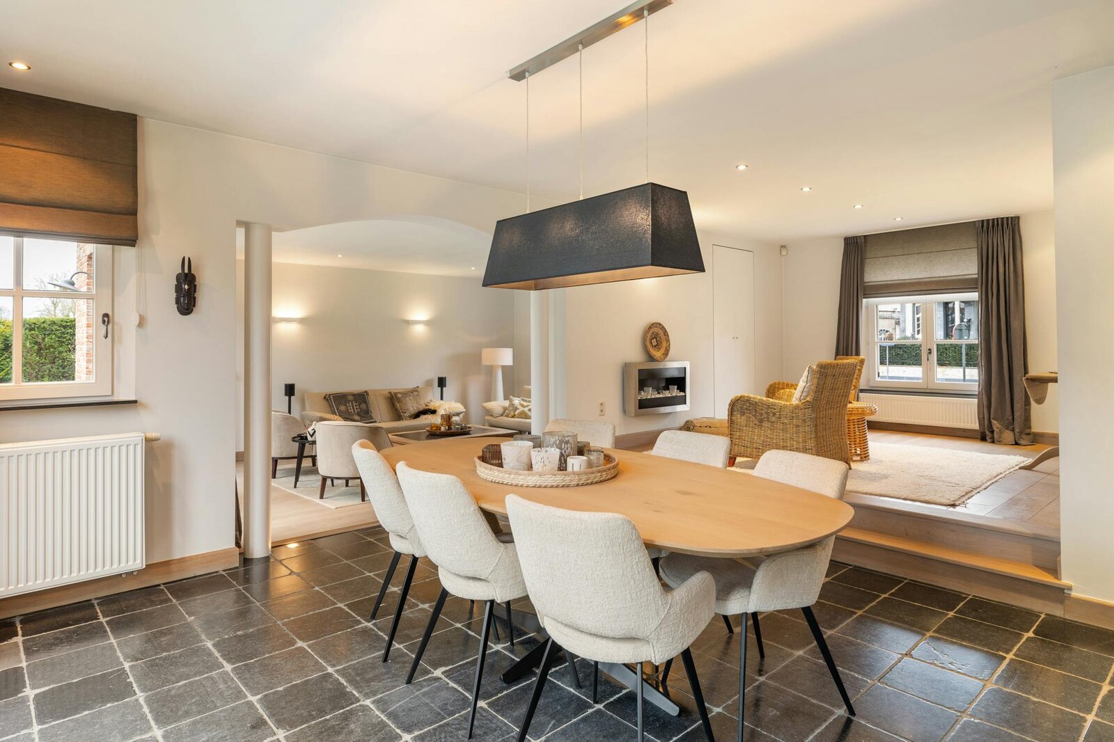 De woning verwelkomt u in lichtrijke leefruimtes die een visuele eenheid vormen. Het salon op parket vloeit naadloos over in de eetkamer op karaktervolle blauwsteen. Subtiele architecturale details en een knusse extra zithoek creëren een boeiend spel van volumes en openheid.