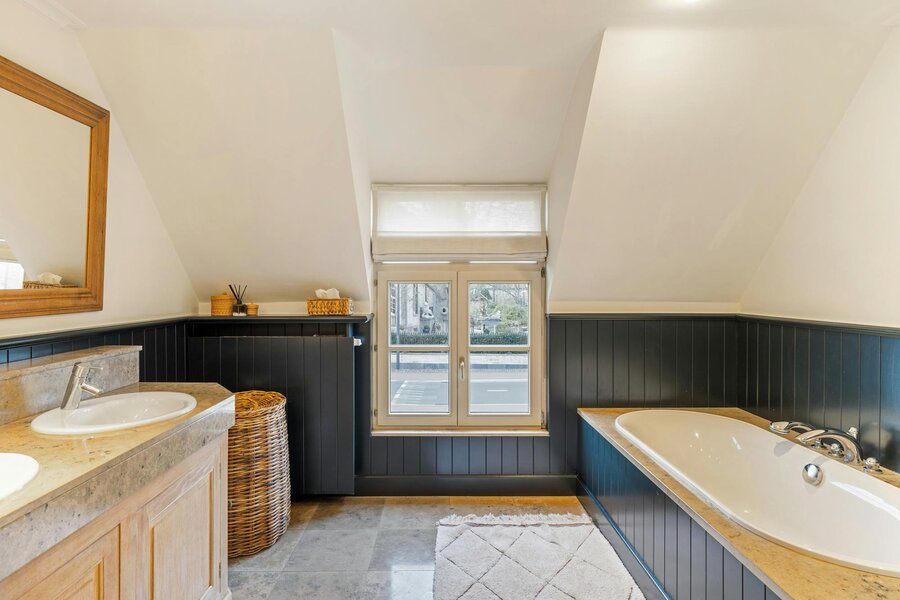 De verdieping herbergt drie volwaardige slaapkamers, allen afgewerkt met warme parketvloeren en indrukwekkend maatwerk (kamerhoge kasten). De villa beschikt over twee stijlvolle badkamers: één met klassieke luxe (ligbad op natuursteen) en een tweede met een moderne, contrastrijke afwerking.