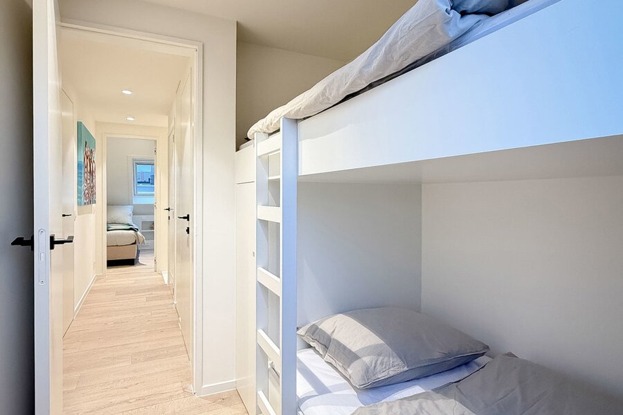 De bovenverdieping beschikt over 2 ruime slaapkamers met ingebouwde kasten, aangevuld met een derde, compacte slaapkamer met een stapelbed, ideaal voor kinderen of gasten. Verder vindt u hier 2 moderne douchekamers en een apart toilet in de nachthal.