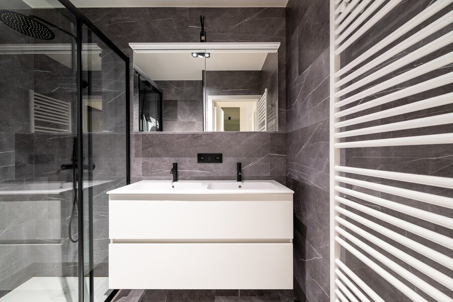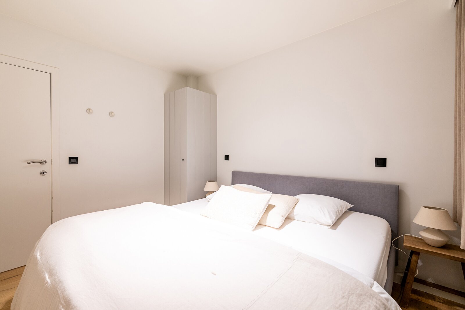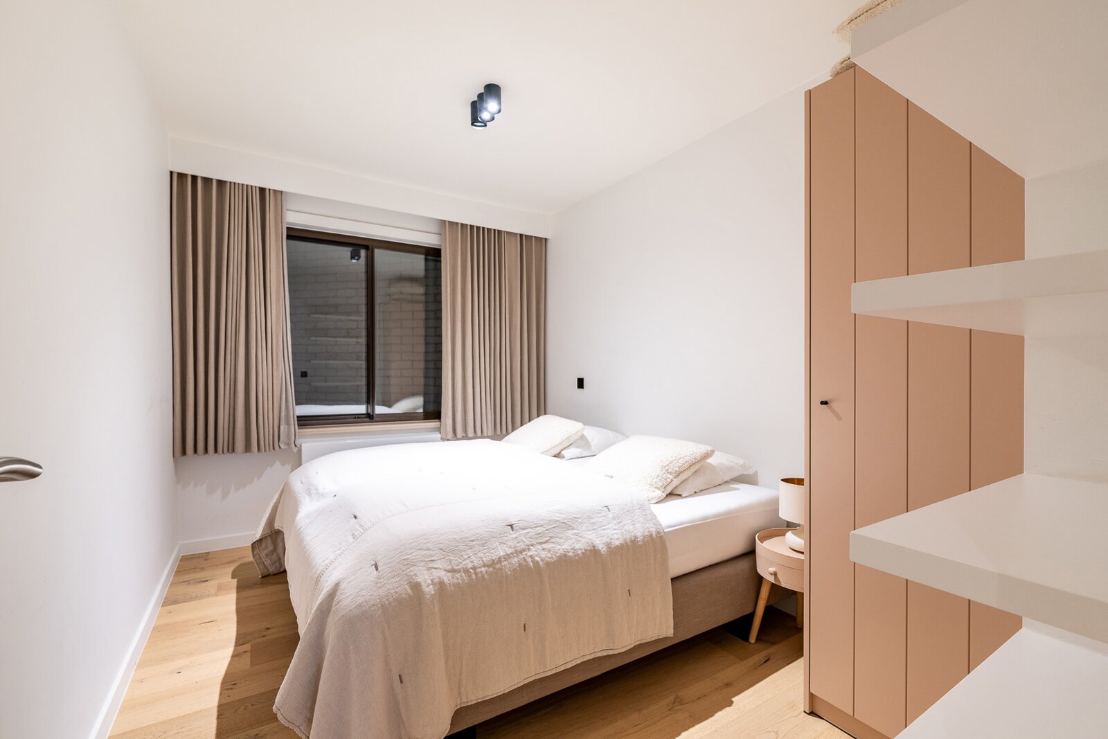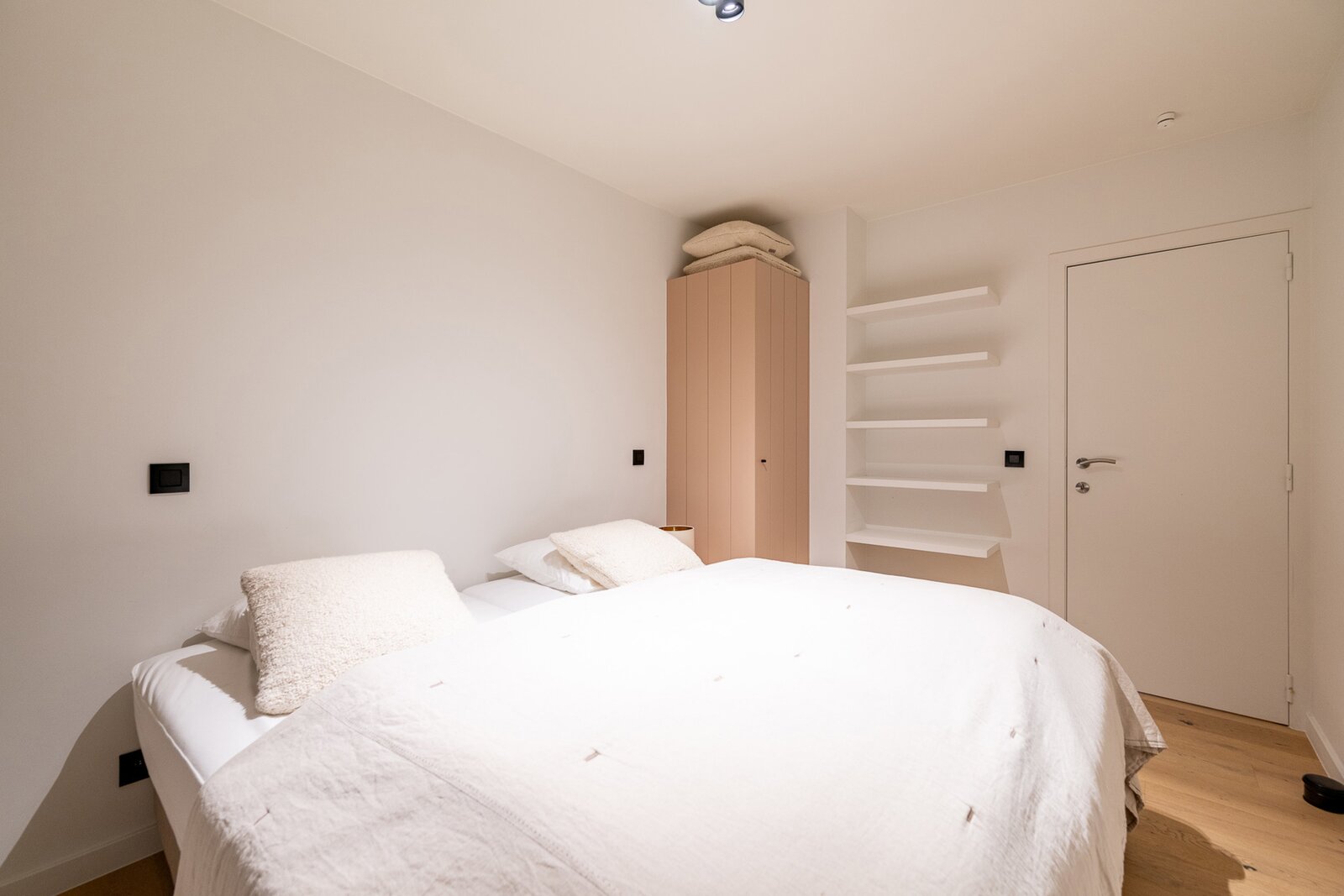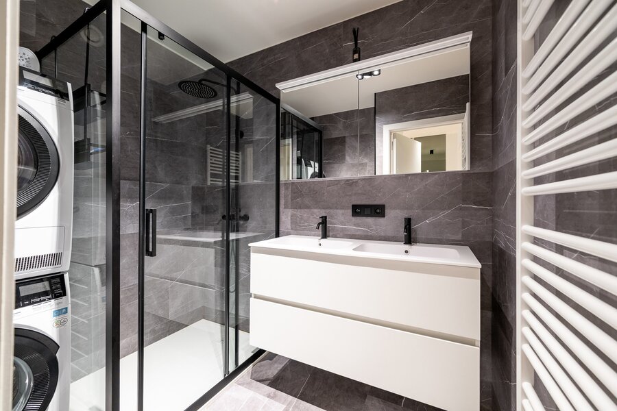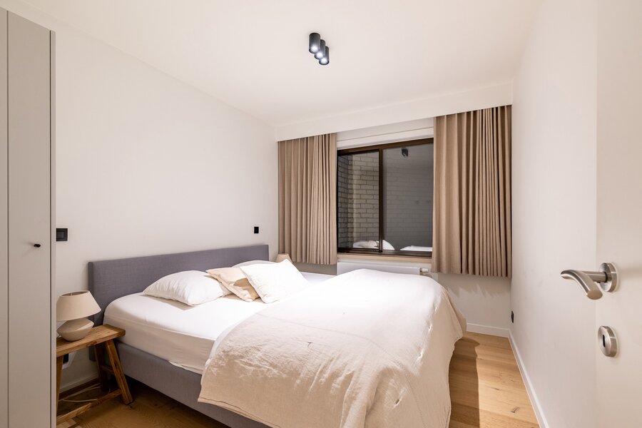Het appartement beschikt over twee volwaardige slaapkamers, beide met voldoende ruimte voor kasten. De moderne douchekamer is uitgerust met een inloopdouche en een aansluiting voor een wasmachine, wat zorgt voor extra praktisch comfort.