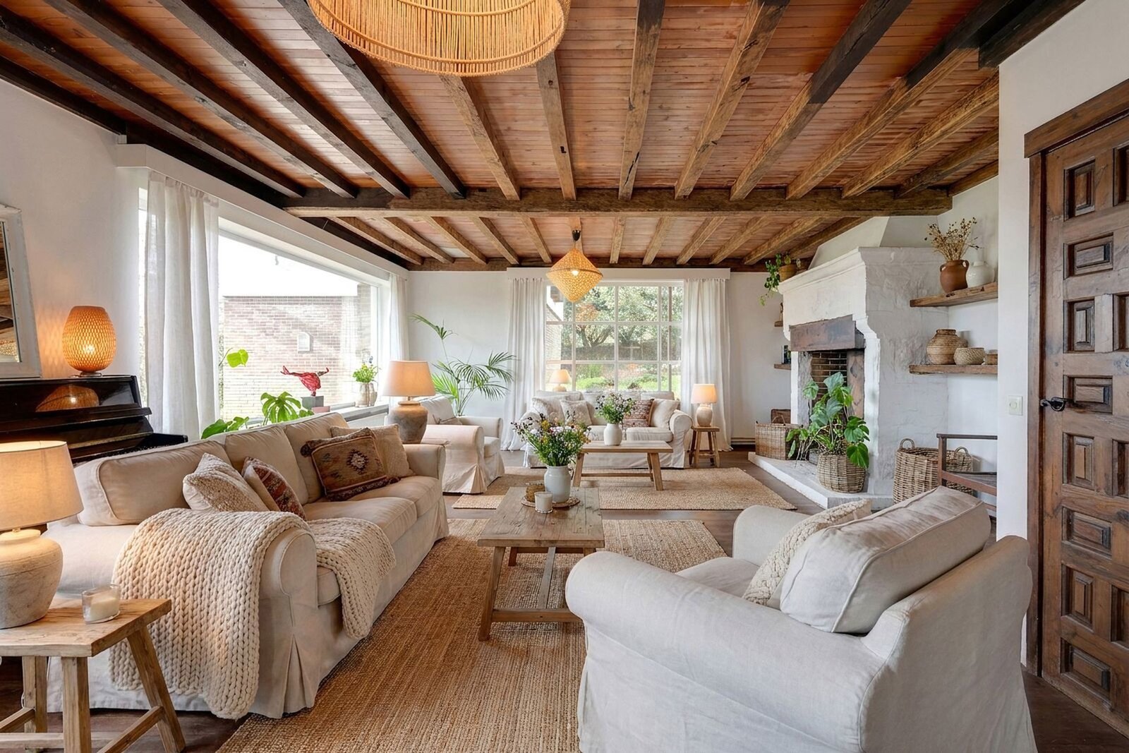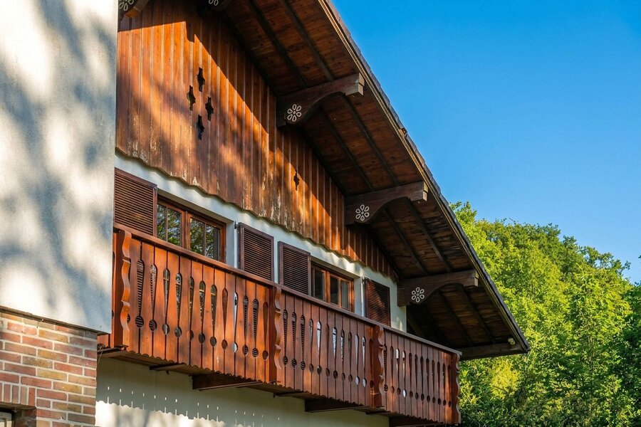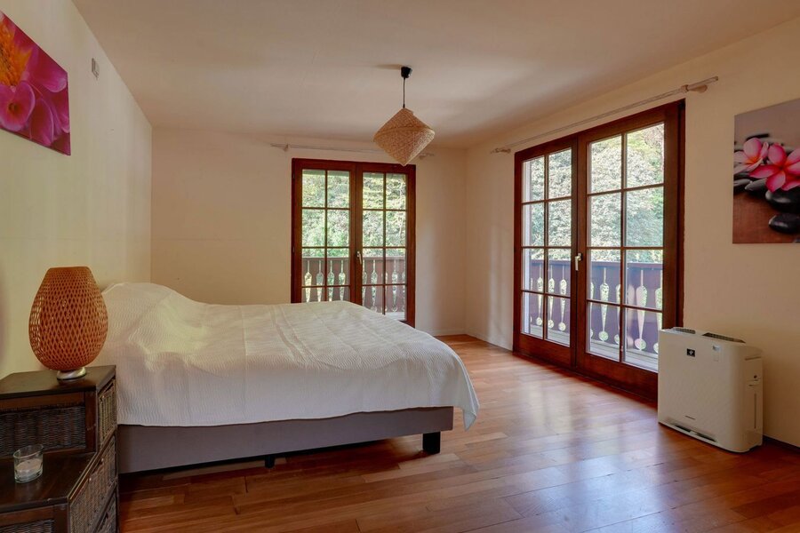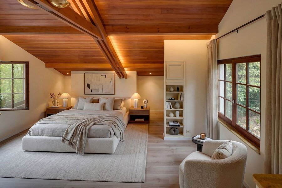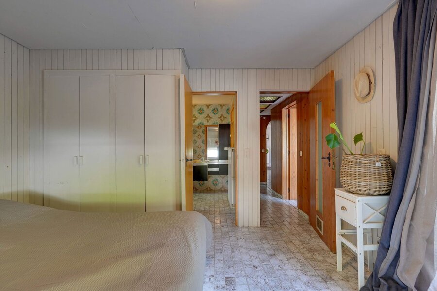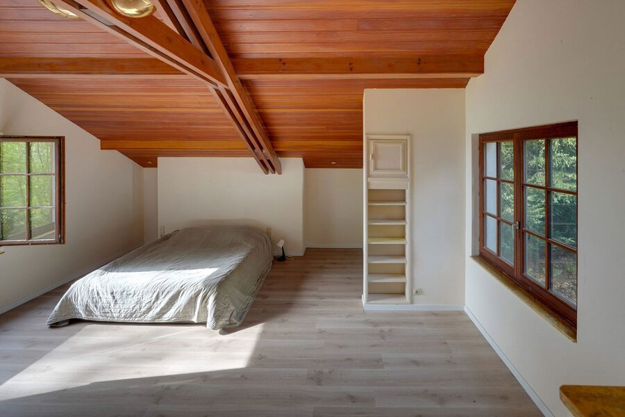 Binnenin ademt de villa sfeer en authenticiteit. De combinatie van warme houtaccenten, parketvloeren en grote raampartijen zorgt voor een lichtrijk en gezellig interieur, waar binnen en buiten naadloos in elkaar overvloeien. De open haard vormt het hart van de leefruimte en draagt bij aan het knusse gevoel.
