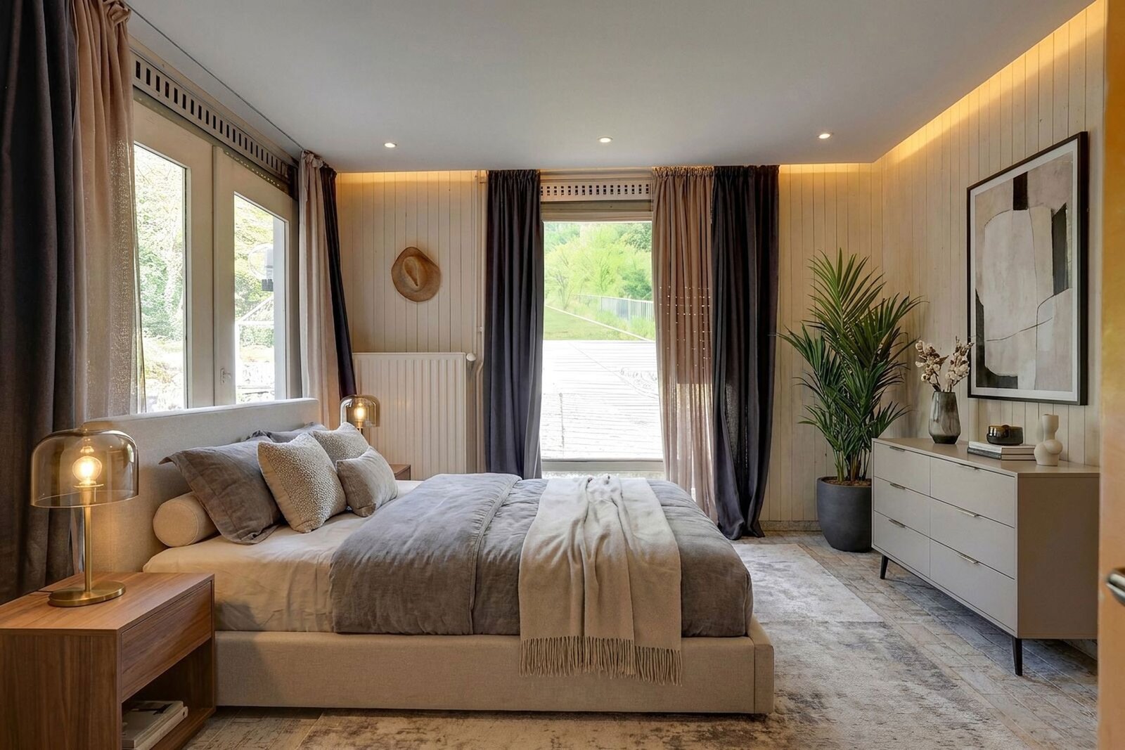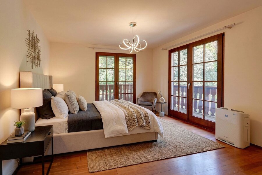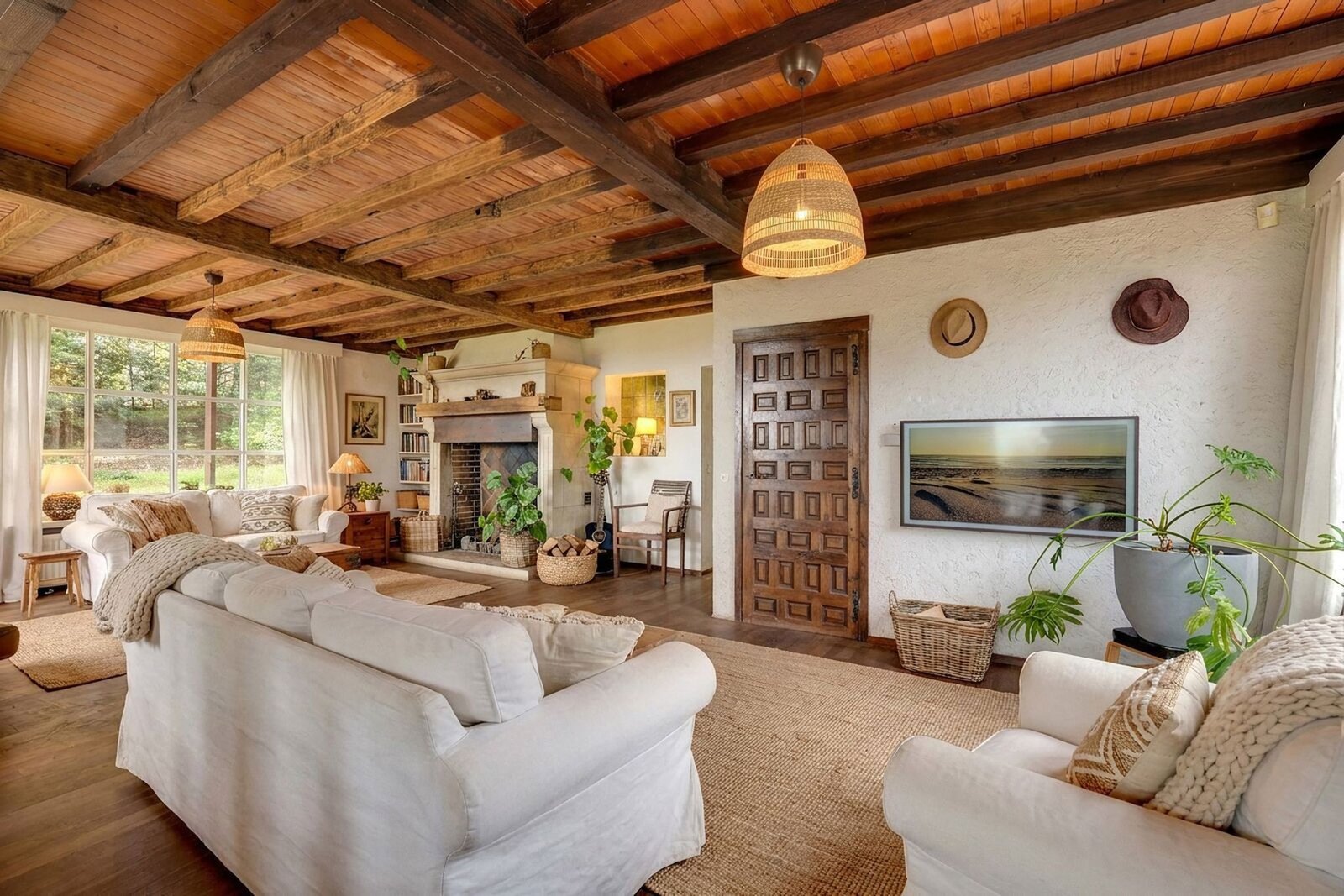 Binnenin ademt de villa sfeer en authenticiteit. De combinatie van warme houtaccenten, parketvloeren en grote raampartijen zorgt voor een lichtrijk en gezellig interieur, waar binnen en buiten naadloos in elkaar overvloeien. De open haard vormt het hart van de leefruimte en draagt bij aan het knusse gevoel.