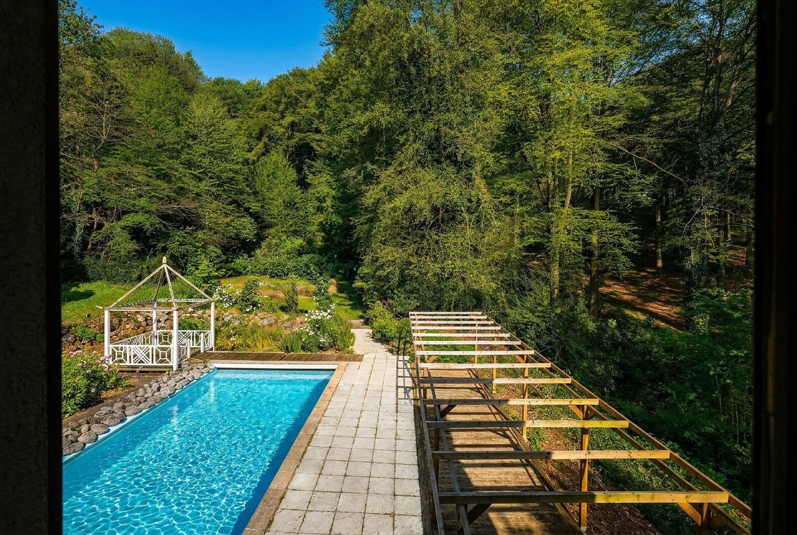Rond de woning vind je meerdere terrassen, een zwembad, een vijver en een sfeervolle pergola – ideaal om op elk moment van de dag en in elk seizoen van de omgeving te genieten.