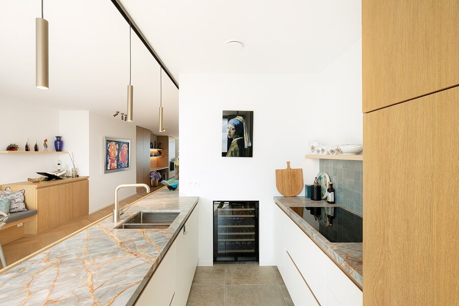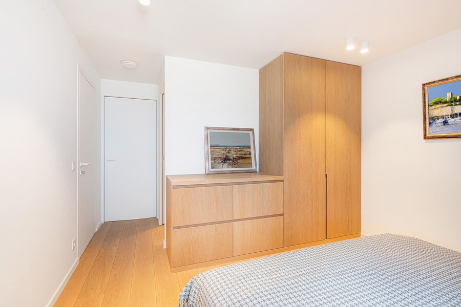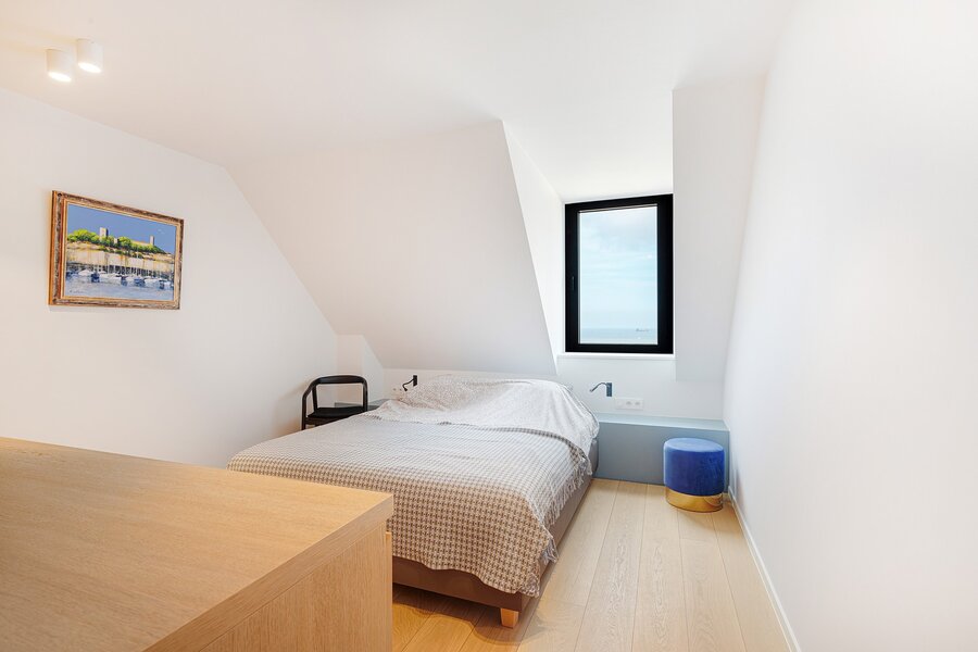 Op de Zeedijk, op een absolute topligging met frontaal zeezicht, bevindt zich dit uitzonderlijk lichtrijke duplexappartement met een royaal ruimtegevoel en een hoogwaardige afwerking. Dankzij de terrassen aan voor- en achterzijde geniet u doorheen de dag van optimale lichtinval, zon en open vergezichten over zee en het hinterland. Indeling: Op de negende verdieping betreedt u de inkomhal met vestiaire en gastentoilet. De lichtrijke leefruimte met gashaard geeft uit op het terras aan de voorzijde en biedt een prachtig frontaal zeezicht. Aansluitend bevindt zich de luxueus ingerichte keuken met Miele-toestellen en eetruimte, uitgevend op het zuidgericht terras achteraan. Verder op deze verdieping een ruime slaapkamer met dressing en ensuite douchekamer, eveneens met toegang tot het terras. Op de tiende verdieping bevinden zich de nachthal met apart toilet en praktische berging, twee volwaardige slaapkamers, een badkamer met ligbad en douche, en een bijkomende douchekamer. Dit appartement wordt gekenmerkt door zijn hoogwaardige afwerking met onder meer natuursteen, plafondhoge blokdeuren, airconditioning en vloerverwarming. Een privatieve kelderberging is inbegrepen. Mogelijkheid tot aankoop van een garagebox in de nabije omgeving. Een zeldzaam aanbod op topligging, waar licht, ruimte en comfort centraal staan.